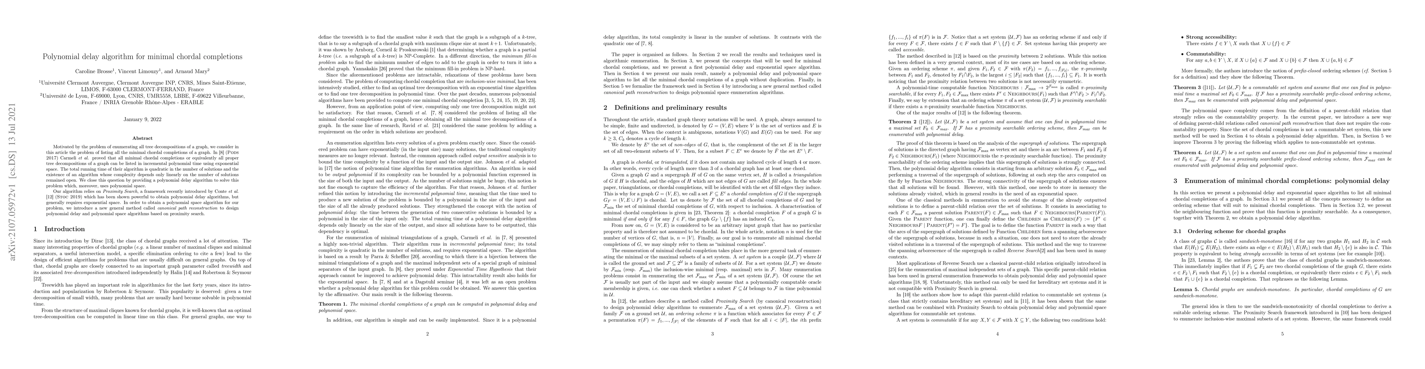 The paper presents a polynomial delay algorithm for enumerating minimal chordal completions of a graph using Proximity Search, a framework for designing polynomial delay algorithms, while ensuring polynomial space complexity through a novel canonical path reconstruction method.