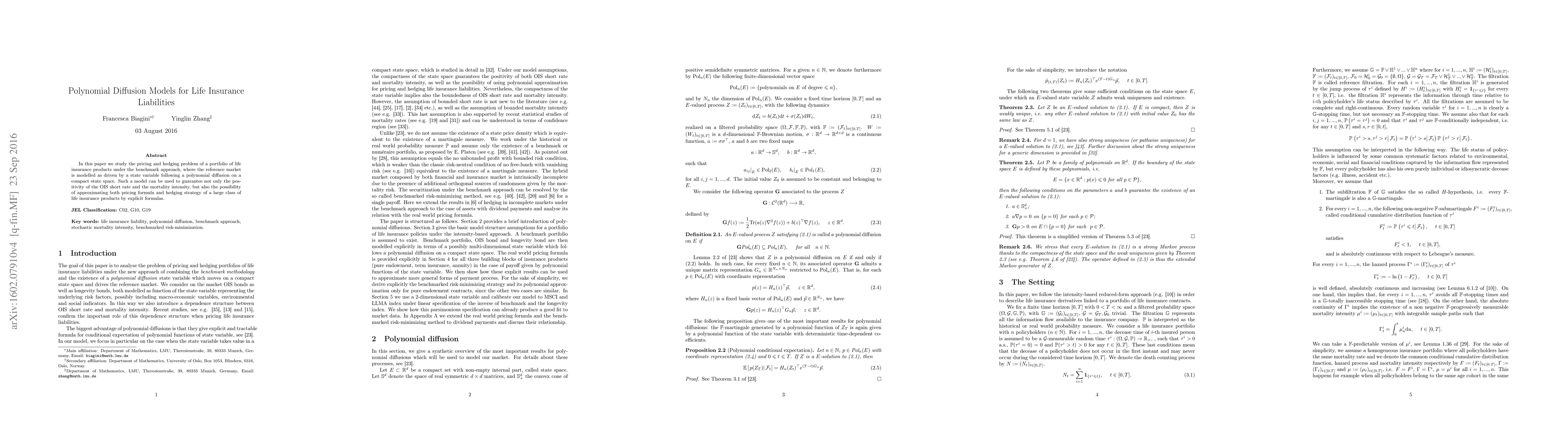 This paper explores the pricing and hedging of life insurance portfolios using polynomial diffusion models, ensuring the positivity of key rates and providing explicit formulas for both pricing and hedging strategies.