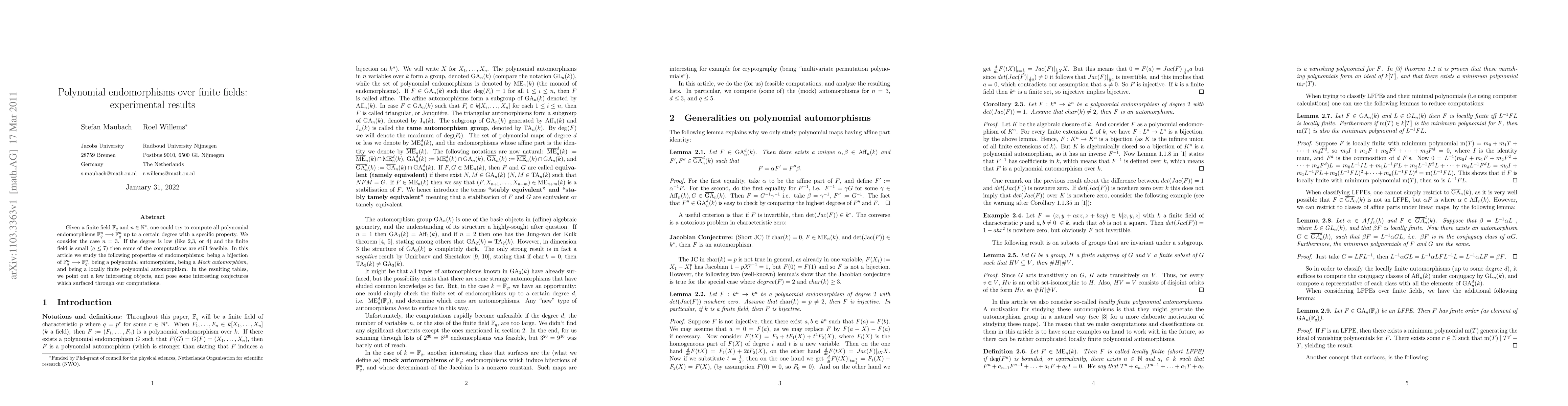 Given a finite field $\F_q$ and $n\in \N^*$, one could try to compute all polynomial endomorphisms $\F_q^n\lp \F_q^n$ up to a certain degree with a specific property. We consider the case $n=3$. If the degree is low (like 2,3, or 4) and the finite field is small ($q\leq 7$) then some of the computations are still feasible. In this article we study the following properties of endomorphisms: being a bijection of $\F_q^n\lp \F_q^n$, being a polynomial automorphism, being a {\em Mock automorphism}, and being a locally finite polynomial automorphism. In the resulting tables, we point out a few interesting objects, and pose some interesting conjectures which surfaced through our computations.