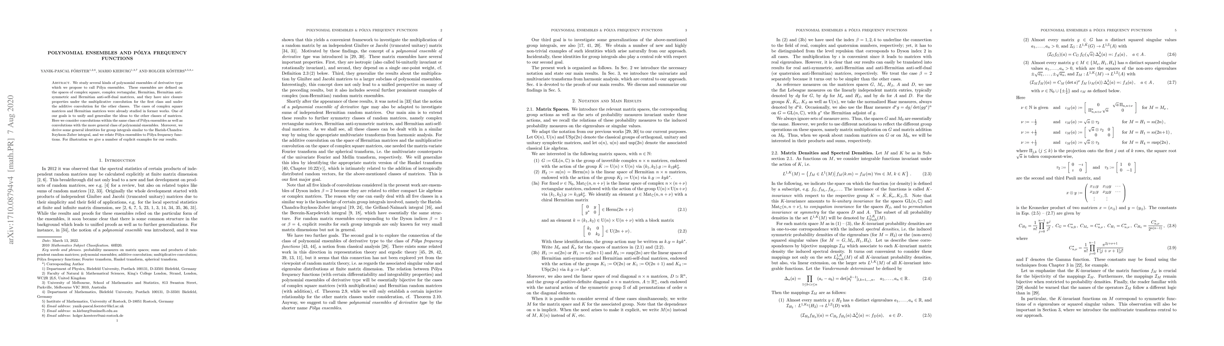 This paper explores polynomial ensembles termed Pólya ensembles defined on various matrix spaces, focusing on their convolution properties and connections to Pólya frequency functions. It aims to generalize previous studies on complex square and Hermitian matrices to other classes, deriving new identities and illustrating results with explicit examples.
