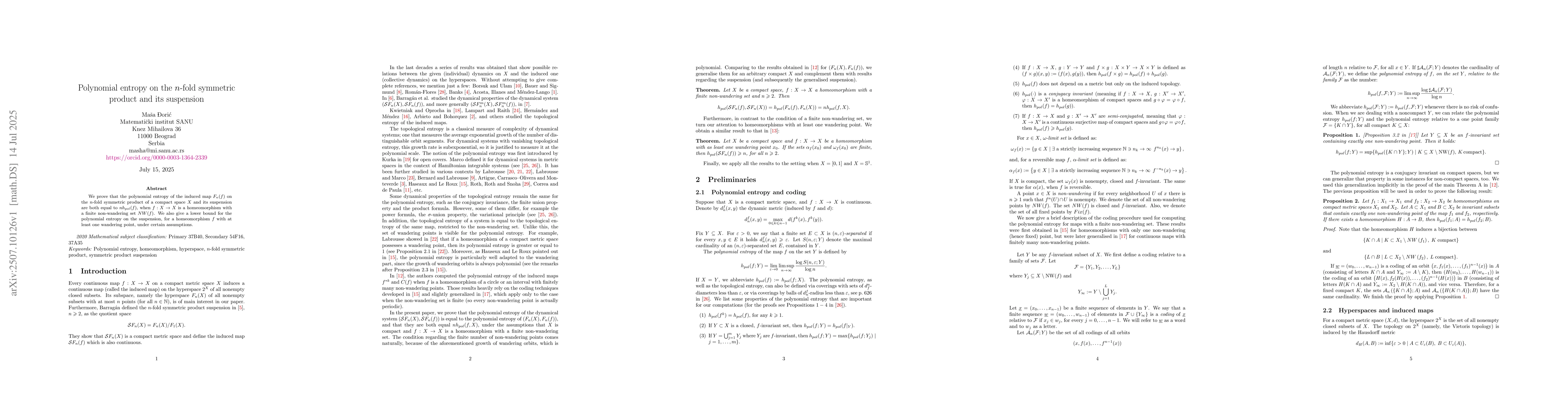 We prove that the polynomial entropy of the induced map $F_n(f)$ on the $n$-fold symmetric product of a compact space $X$ and its suspension are both equal to $nh_{pol}(f)$, when $f:X\to X$ is a homeomorphism with a finite non-wandering set $NW(f)$. We also give a lower bound for the polynomial entropy on the suspension, for a homeomorphism $f$ with at least one wandering point, under certain assumptions.