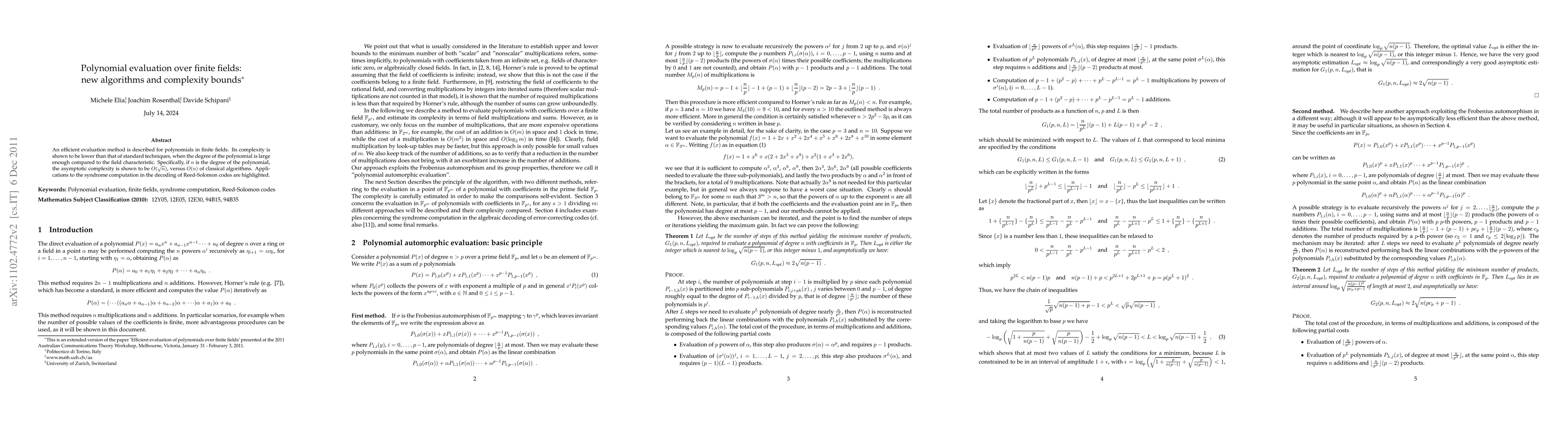 This paper presents a new algorithm for evaluating polynomials over finite fields with lower complexity compared to standard methods, particularly effective for high-degree polynomials. The method's efficiency is demonstrated in the context of Reed-Solomon code decoding through syndrome computation.