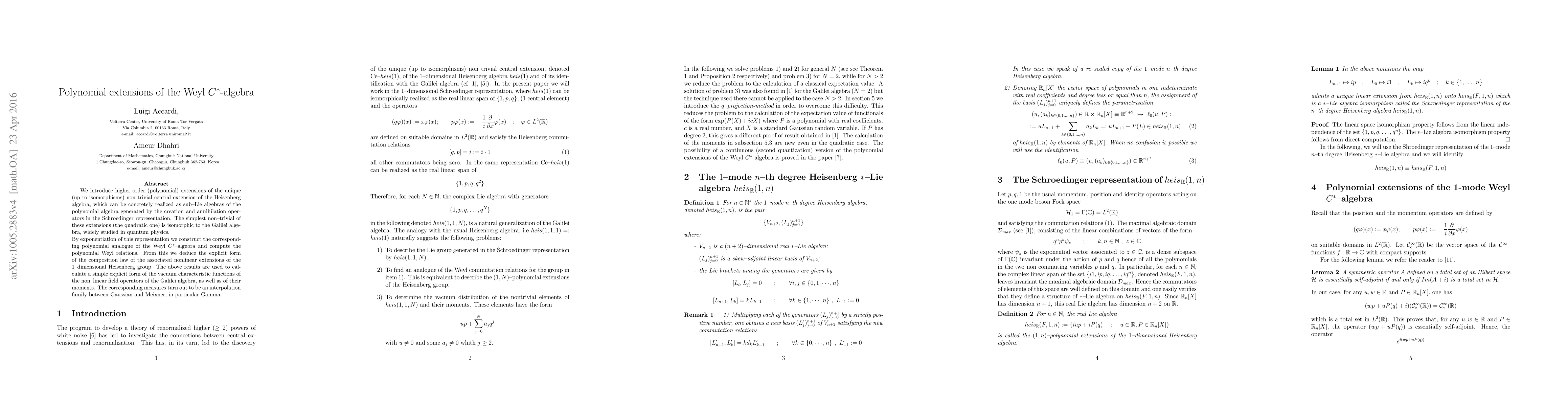 We introduce higher order (polynomial) extensions of the unique (up to isomorphisms) non trivial central extension of the Heisenberg algebra. Using the boson representation of the latter, we construct the corresponding polynomial analogue of the Weyl $C^*$-algebra and use this result to deduce the explicit form of the composition law of the associated generalization of the 1-dimensional Heisenberg group. These results are used to calculate the vacuum characteristic func- tions as well as the moments of the observables in the Galilei algebra. The continuous extensions of these objects gives a new type of second quantization which even in the quadratic case is quite different from the quadratic Fock functor.