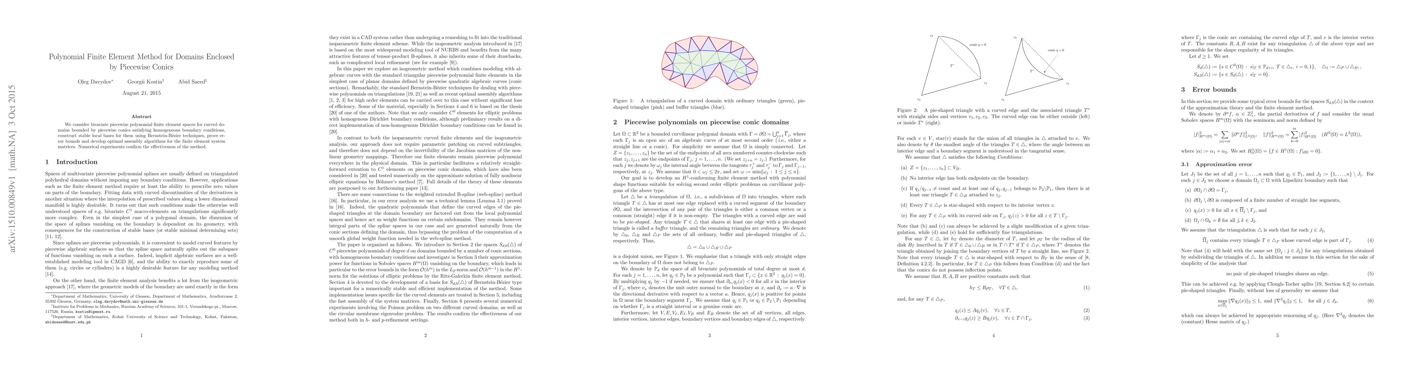 This paper develops a polynomial finite element method for curved domains defined by piecewise conics, utilizing Bernstein-Bézier techniques to construct stable local bases. It proves error bounds and optimal assembly algorithms, and numerical experiments validate the method's effectiveness.
