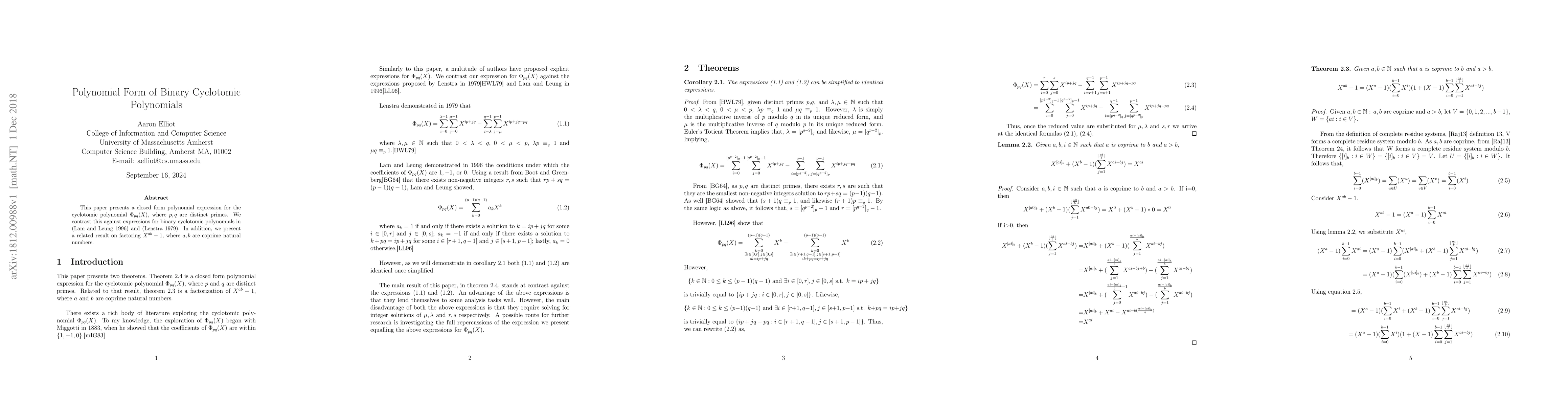This paper derives a closed form polynomial expression for binary cyclotomic polynomials, comparing it with earlier forms presented by Lam and Leung (1996) and Lenstra (1979). The new form aims to provide a more straightforward representation.