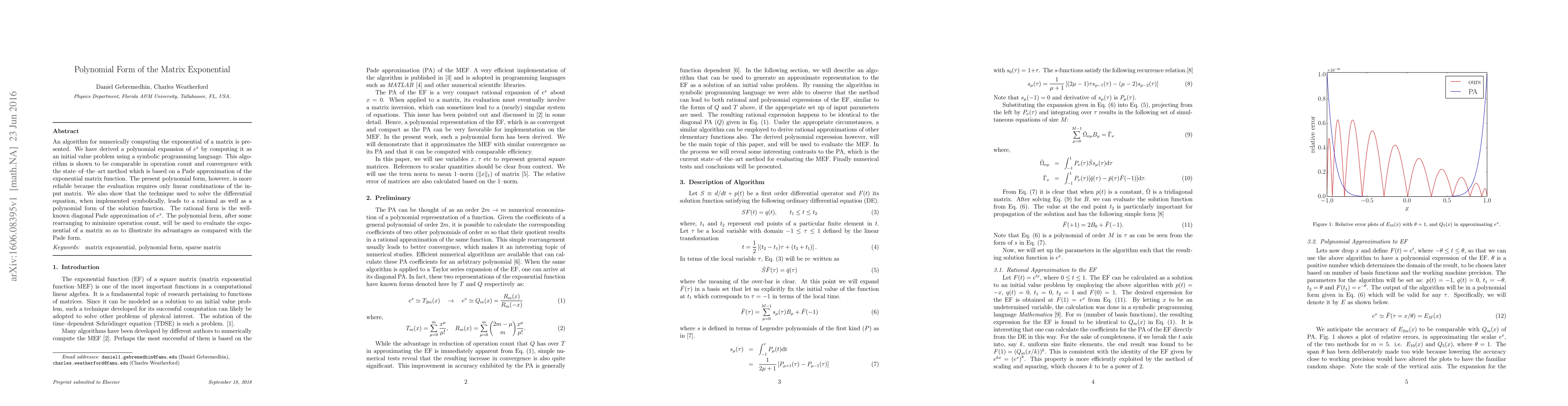 An algorithm for numerically computing the exponential of a matrix is presented. We have derived a polynomial expansion of $e^x$ by computing it as an initial value problem using a symbolic programming language. This algorithm is shown to be comparable in operation count and convergence with the state--of--the--art method which is based on a Pade approximation of the exponential matrix function. The present polynomial form, however, is more reliable because the evaluation requires only linear combinations of the input matrix. We also show that the technique used to solve the differential equation, when implemented symbolically, leads to a rational as well as a polynomial form of the solution function. The rational form is the well-known diagonal Pade approximation of $e^x$. The polynomial form, after some rearranging to minimize operation count, will be used to evaluate the exponential of a matrix so as to illustrate its advantages as compared with the Pade form.