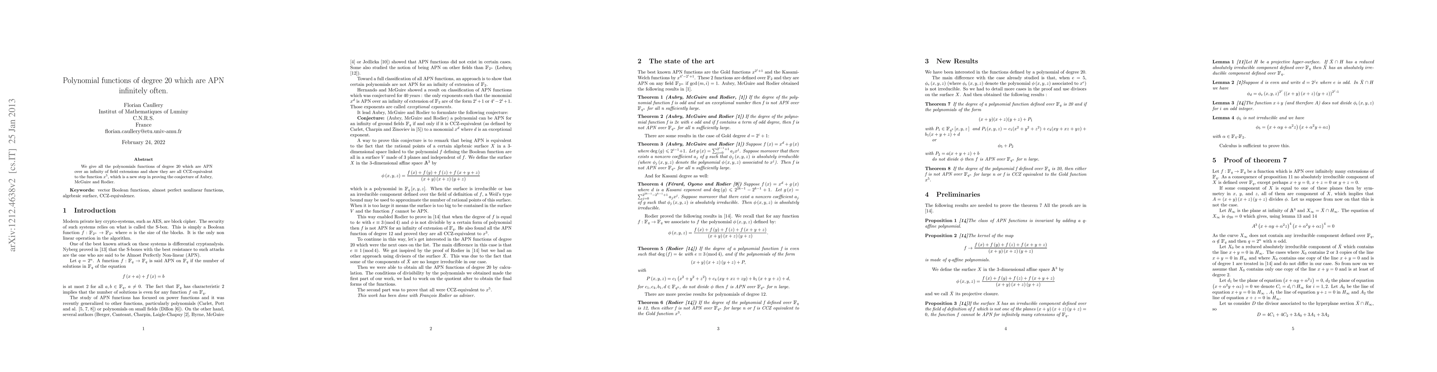 We give all the polynomials functions of degree 20 which are APN over an infinity of field extensions and show they are all CCZ-equivalent to the function $x^5$, which is a new step in proving the conjecture of Aubry, McGuire and Rodier.