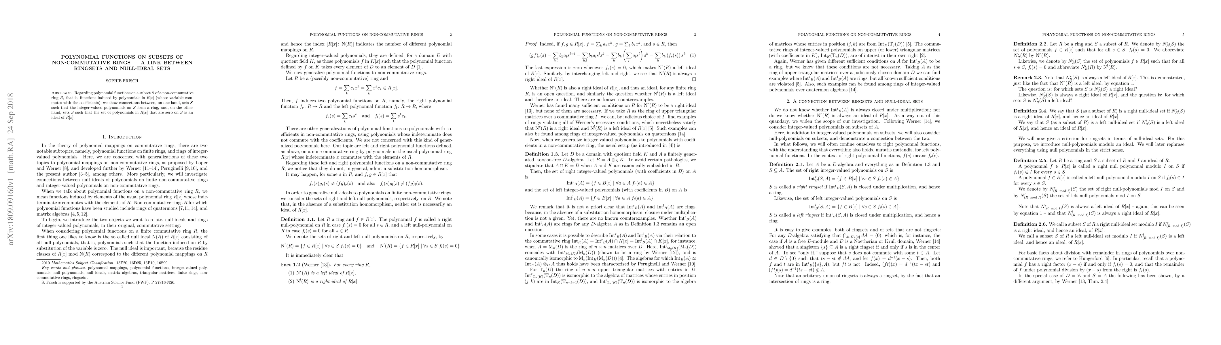 This paper explores connections between polynomial functions on subsets of non-commutative rings, linking ringsets to null-ideal sets in terms of integer-valued polynomials and ideals of the polynomial ring.