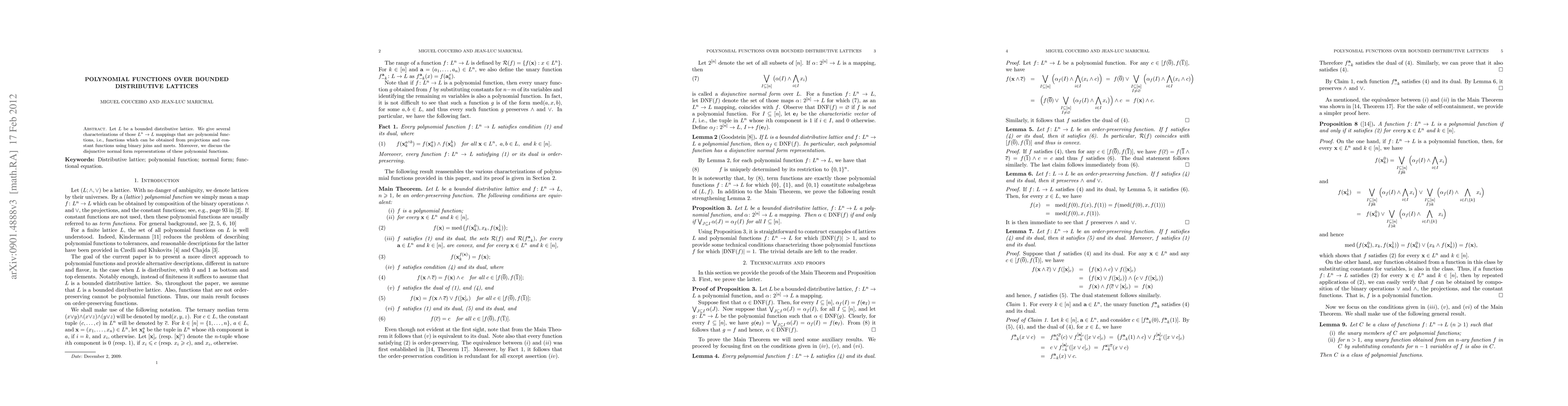 This paper characterizes polynomial functions on bounded distributive lattices, showing they can be constructed from projections and constants using binary joins and meets. It also explores their disjunctive normal form representations.