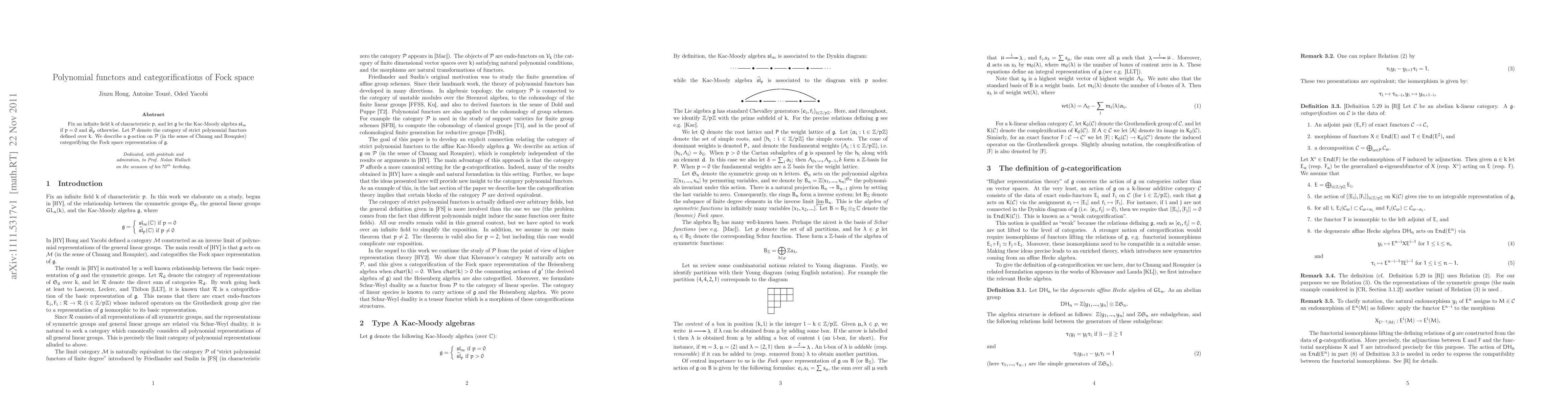 This paper introduces a $\g$-action on the category $\PP$ of strict polynomial functors over a field $k$, categorifying the Fock space representation of the Kac-Moody algebra $\g$, where $\g$ is either $\mathfrak{sl}_{\infty}$ or $\hat{\mathfrak{sl}}_p$ depending on the characteristic of $k$.