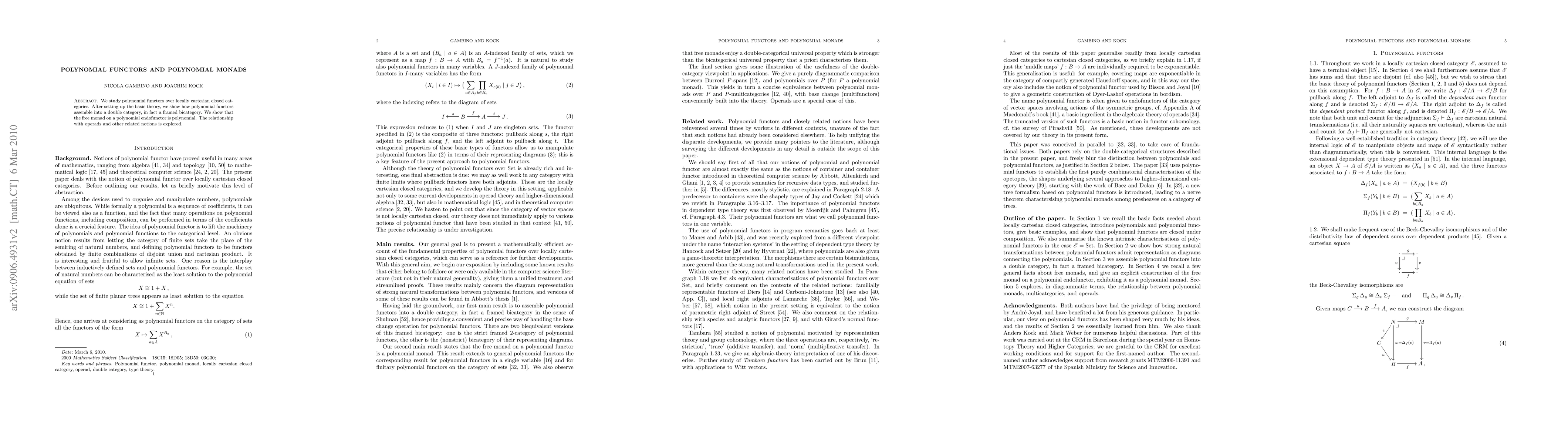 Summary: The paper explores polynomial functors within locally cartesian closed categories, demonstrating their organization into a framed bicategory, and reveals that the monad derived from a polynomial endofunctor remains polynomial, alongside connections to operads and related concepts.