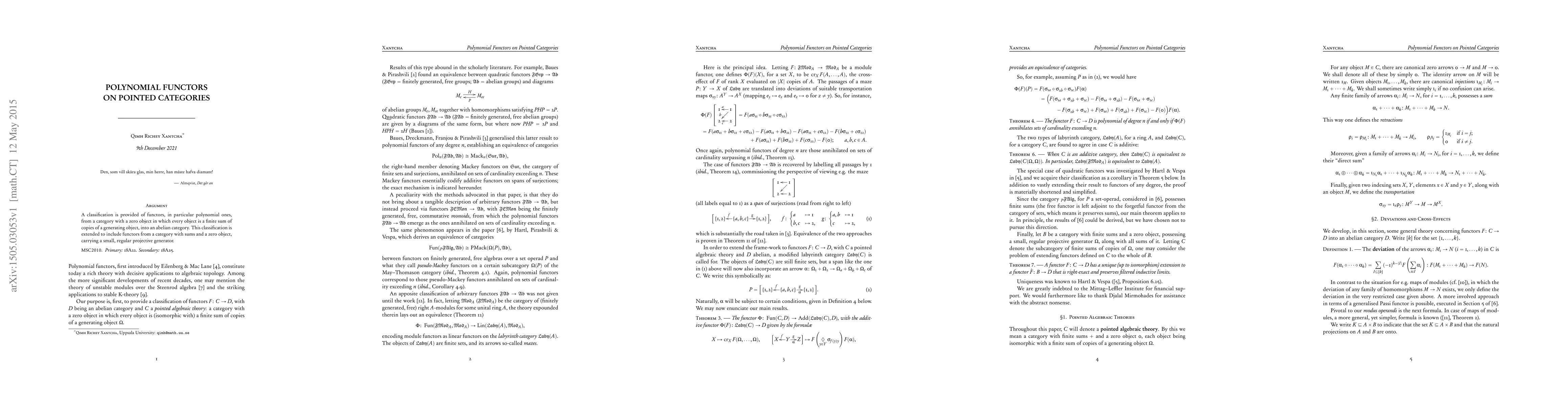 This paper classifies polynomial functors from a specific category with a zero object and a generating object into an abelian category, extending the classification to functors with sums and a regular projective generator. The focus is on understanding the structure and properties of these functors within the given categorical framework.