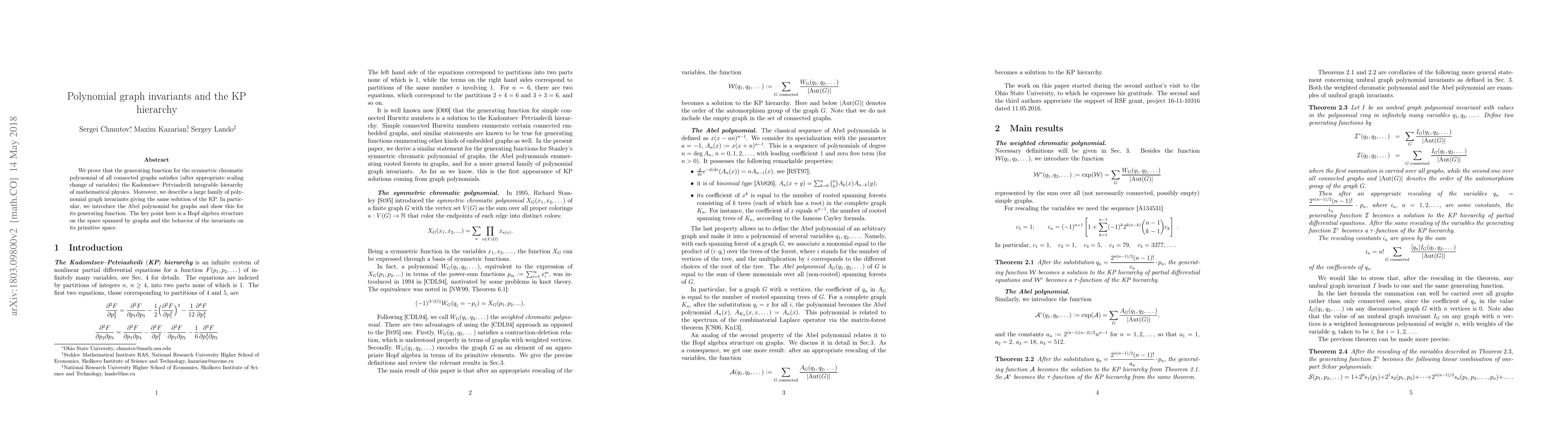 We prove that the generating function for the symmetric chromatic polynomial of all connected graphs satisfies (after appropriate scaling change of variables) the Kadomtsev--Petviashvili integrable hierarchy of mathematical physics. Moreover, we describe a large family of polynomial graph invariants giving the same solution of the KP. In particular, we introduce the Abel polynomial for graphs and show this for its generating function. The key point here is a Hopf algebra structure on the space spanned by graphs and the behavior of the invariants on its primitive space.