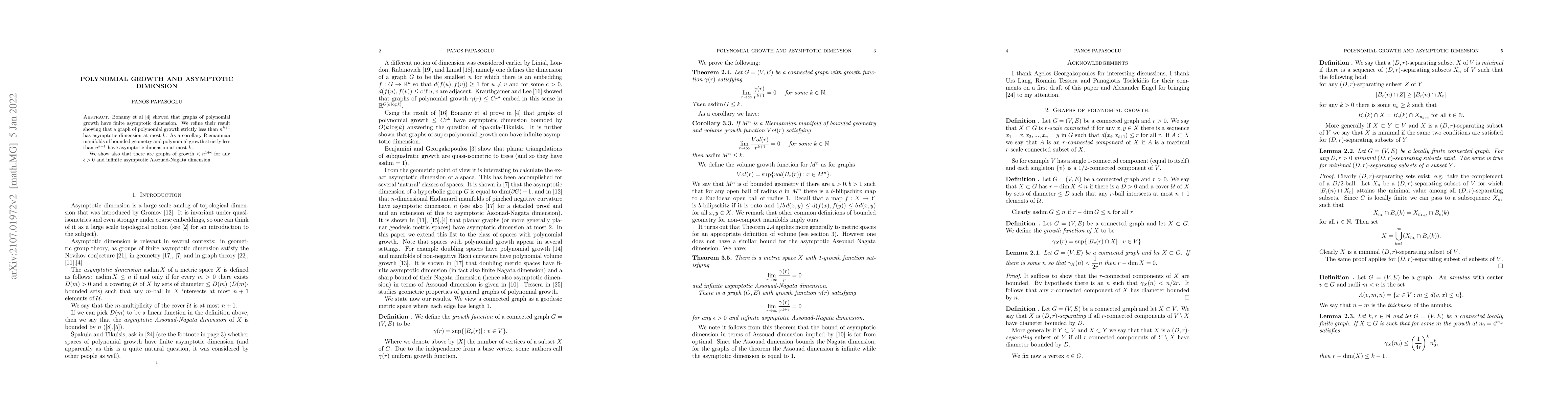 Summary: Bonamy et al. demonstrated that graphs with polynomial growth have finite asymptotic dimension. This paper refines that result, proving that graphs with growth strictly less than $n^{k+1}$ have an asymptotic dimension at most $k$. It also shows that Riemannian manifolds with similar growth constraints have an asymptotic dimension of at most $k$, while graphs with growth $<n^{1+\epsilon}$ can still have infinite asymptotic Assouad-Nagata dimension.