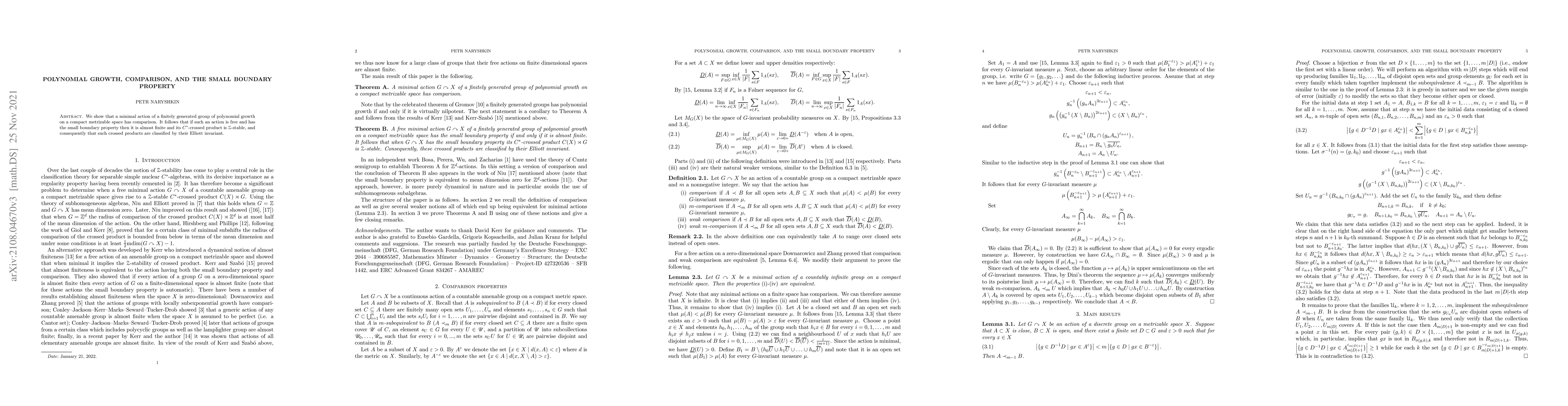 We show that a minimal action of a finitely generated group of polynomial growth on a compact metrizable space has comparison. It follows that if such an action has the small boundary property then it is almost finite and its $C^*$-crossed product is $\mathcal{Z}$-stable, and consequently that such crossed products are classified by their Elliott invariant.