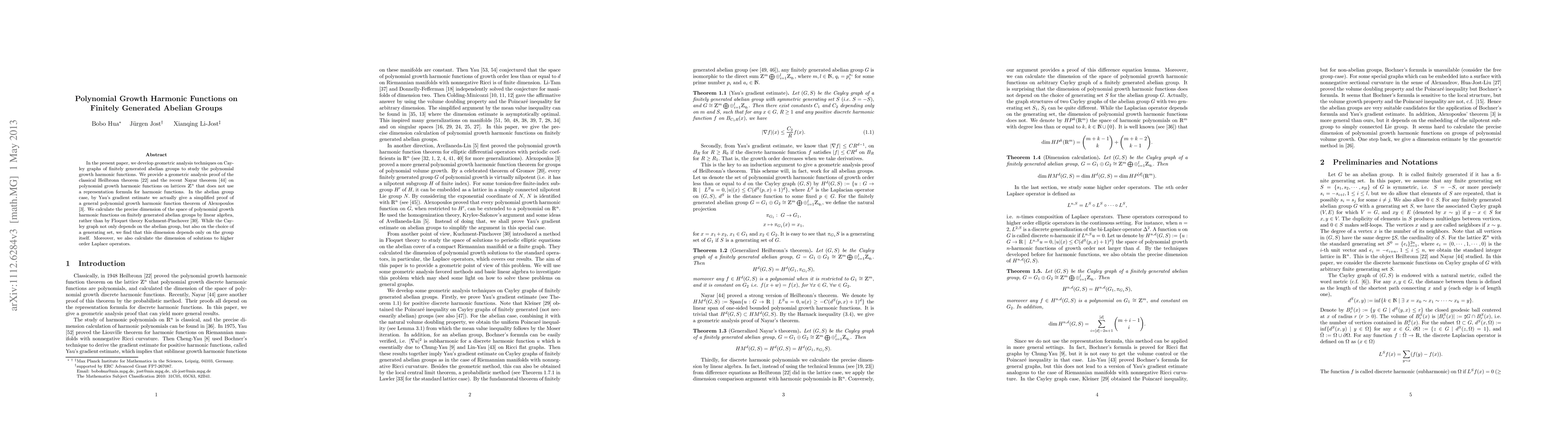 This paper uses geometric analytic techniques on Cayley graphs of finitely generated abelian groups to study polynomial growth harmonic functions, proving the Heilbronn and Nayar theorems without representation formulas, and determining the dimension of the space of such functions, which depends solely on the group, not the generating set.