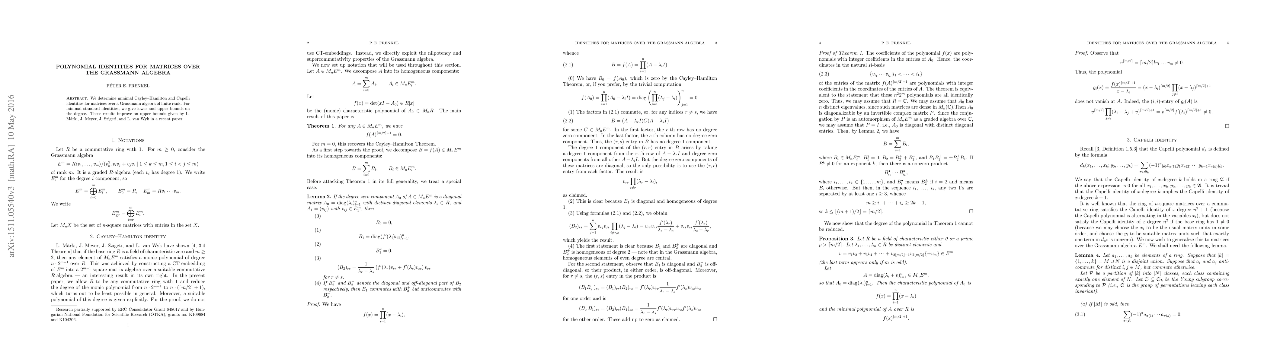 This paper establishes minimal Cayley-Hamilton and Capelli identities for matrices over a finite rank Grassmann algebra, providing improved upper bounds on the degree of these identities compared to previous results by Márki, Meyer, Szigeti, and van Wyk.