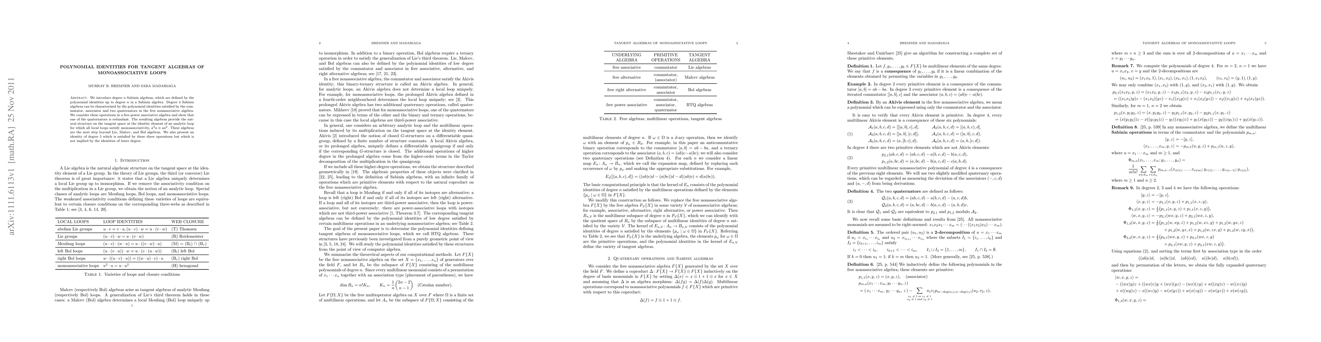 We introduce degree n Sabinin algebras, which are defined by the polynomial identities up to degree n in a Sabinin algebra. Degree 4 Sabinin algebras can be characterized by the polynomial identities satisfied by the commutator, associator and two quaternators in the free nonassociative algebra. We consider these operations in a free power associative algebra and show that one of the quaternators is redundant. The resulting algebras provide the natural structure on the tangent space at the identity element of an analytic loop for which all local loops satisfy monoassociativity, a^2 a = a a^2. These algebras are the next step beyond Lie, Malcev, and Bol algebras. We also present an identity of degree 5 which is satisfied by these three operations but which is not implied by the identities of lower degree.
