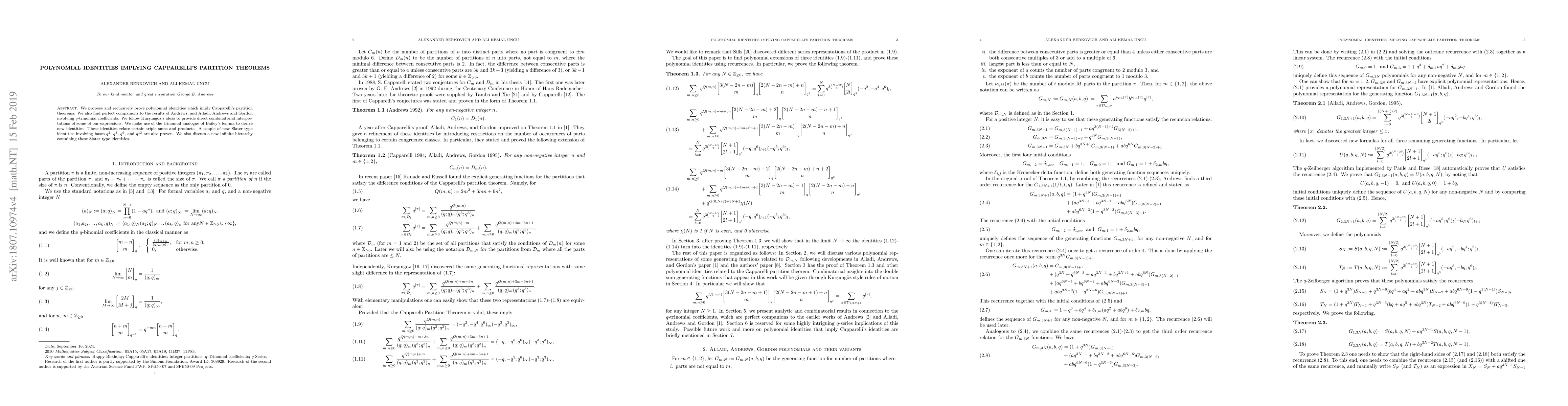 This paper presents polynomial identities that imply Capparelli's partition theorems, establishes perfect companions to Andrews' and Alladi's results, and uses combinatorial interpretations and Bailey's lemma to derive new identities relating triple sums and products, along with new Slater type identities.