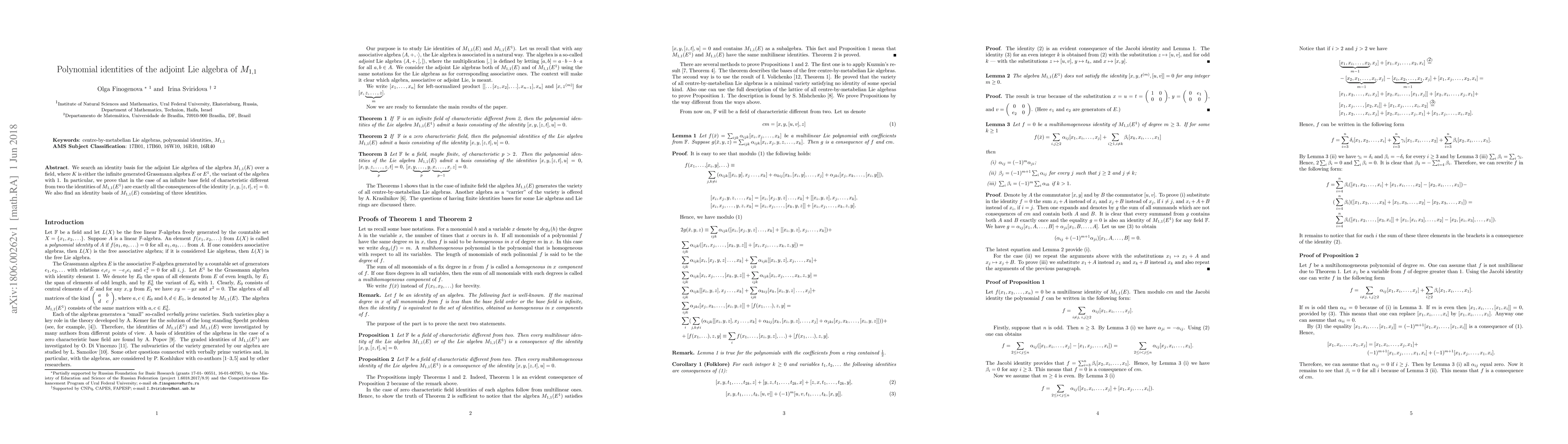 This paper identifies an identity basis for the adjoint Lie algebra of $M_{1,1}(K)$, showing that for an infinite base field of characteristic not two, $M_{1,1}(E^1)$'s identities are derived from $[x,y,[z,t],v]=0$. Additionally, it establishes a three-identity basis for $M_{1,1}(E)$.