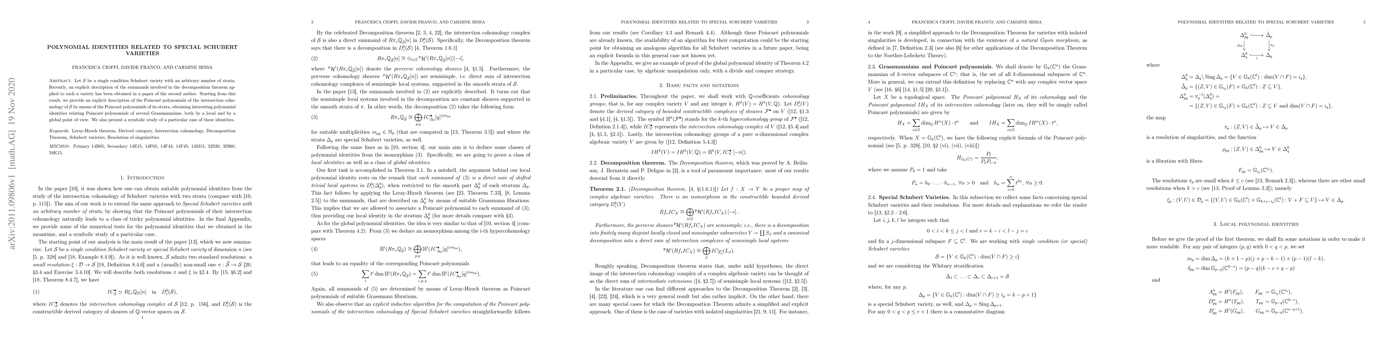 This paper derives explicit polynomial identities related to the Poincaré polynomials of intersection cohomology for special Schubert varieties, using results from a prior study on their decomposition. It also explores these identities in both local and global contexts, and conducts a symbolic analysis of a specific case.