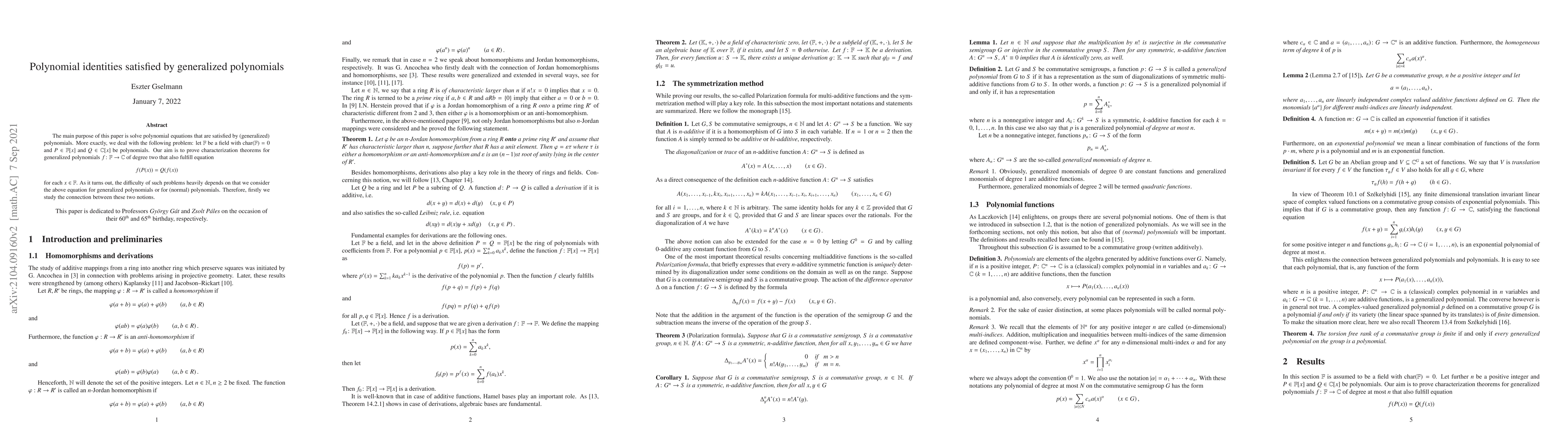 The main purpose of this paper is solve polynomial equations that are satisfied by (generalized) polynomials. More exactly, we deal with the following problem: let $\mathbb{F}$ be a field with $\mathrm{char}(\mathbb{F})=0$ and $P\in \mathbb{F}[x]$ and $Q\in \mathbb{C}[x]$ be polynomials. Our aim is to prove characterization theorems for generalized polynomials $f\colon \mathbb{F}\to \mathbb{C}$ of degree two that also fulfill equation \[ f(P(x))= Q(f(x)) \] for each $x\in \mathbb{F}$. As it turns out, the difficulty of such problems heavily depends on that we consider the above equation for generalized polynomials or for (normal) polynomials. Therefore, firstly we study the connection between these two notions.
