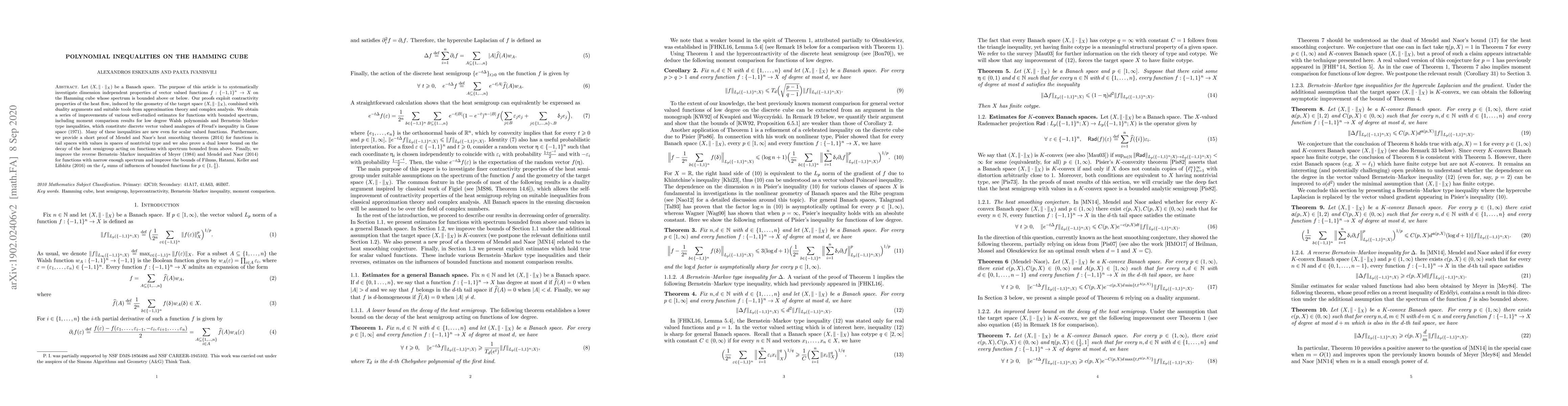 Let $(X,\|\cdot\|_X)$ be a Banach space. The purpose of this article is to systematically investigate dimension independent properties of vector valued functions $f:\{-1,1\}^n\to X$ on the Hamming cube whose spectrum is bounded above or below. Our proofs exploit contractivity properties of the heat flow, induced by the geometry of the target space $(X,\|\cdot\|_X)$, combined with duality arguments and suitable tools from approximation theory and complex analysis. We obtain a series of improvements of various well-studied estimates for functions with bounded spectrum, including moment comparison results for low degree Walsh polynomials and Bernstein-Markov type inequalities, which constitute discrete vector valued analogues of Freud's inequality in Gauss space (1971). Many of these inequalities are new even for scalar valued functions. Furthermore, we provide a short proof of Mendel and Naor's heat smoothing theorem (2014) for functions on tail spaces with values in spaces of nontrivial type and we also prove a dual lower bound on the decay of the heat semigroup acting on functions with spectrum bounded from above. Finally, we improve the reverse Bernstein-Markov inequalities of Meyer (1984) and Mendel and Naor (2014) for functions with narrow enough spectrum and improve the bounds of Filmus, Hatami, Keller and Lifshitz (2016) on the $\ell_p$ sums of influences of bounded functions for $p\in\big(1,\frac{4}{3}\big)$.