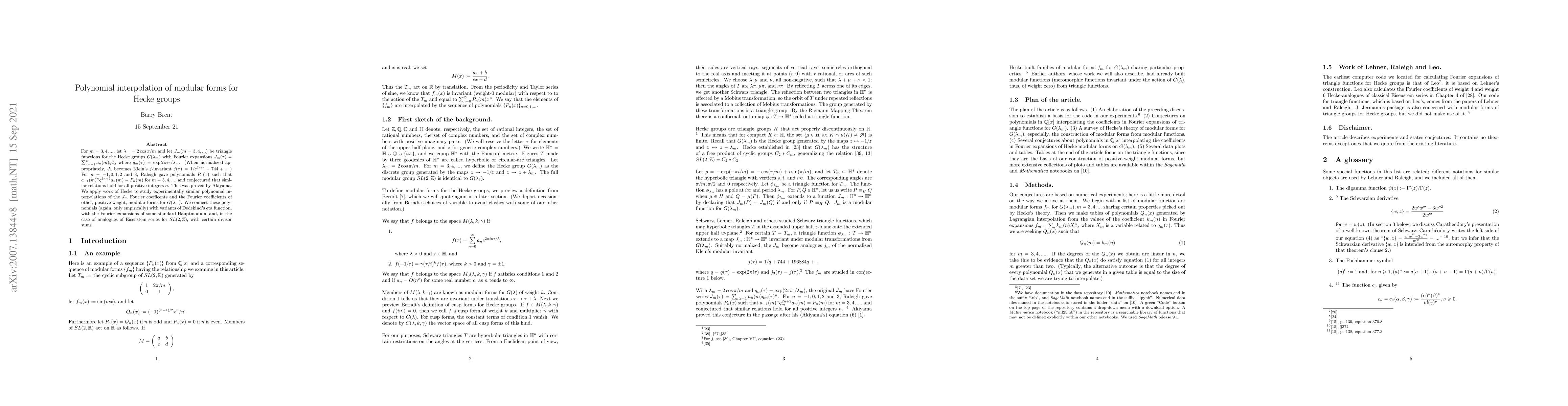 Extending work of J. Raleigh, we compute polynomials $P_{n,F}(x)$ associated to certain families $F = \{f_m\}_{m = 3, 4, ...}$ of modular forms for Hecke groups $G(\lambda_m)$ with the property that $P_{n,F}(m)$ is the $n^{th}$ coefficient in the Fourier expansion of $f_m$. We express the $P_{n,F}$ in terms of the Fourier expansions of well-known Hauptmoduln, or in terms of certain divisor-sums. By studying the complex roots of the $P_n$, we relate them to Lehmer's question about Ramanujan's tau function. We review the theory of triangle functions and Hecke's theory of modular forms in order to establish a basis for our code, some of which originates in the dissertation of J. Leo. The article is an account of numerical experiments; the only theorems in it belong to work by others that we review as described above.
