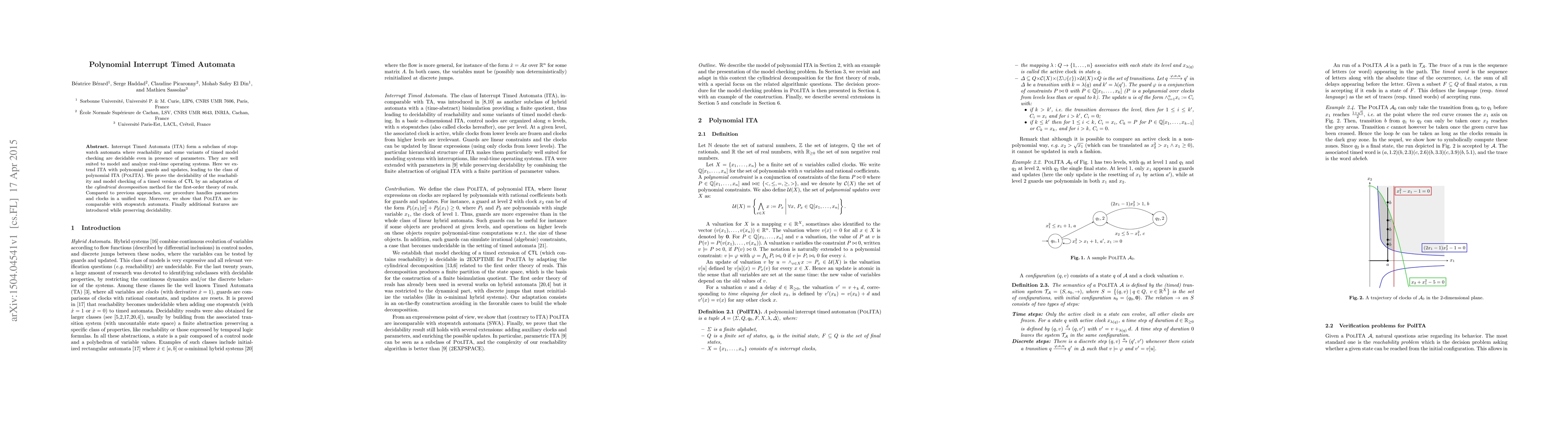 This paper extends Interrupt Timed Automata (ITA) with polynomial guards and updates, creating Polynomial Interrupt Timed Automata (PolITA). The authors demonstrate the decidability of reachability and model checking for a timed version of CTL using an adapted cylindrical decomposition method, while handling parameters and clocks uniformly.