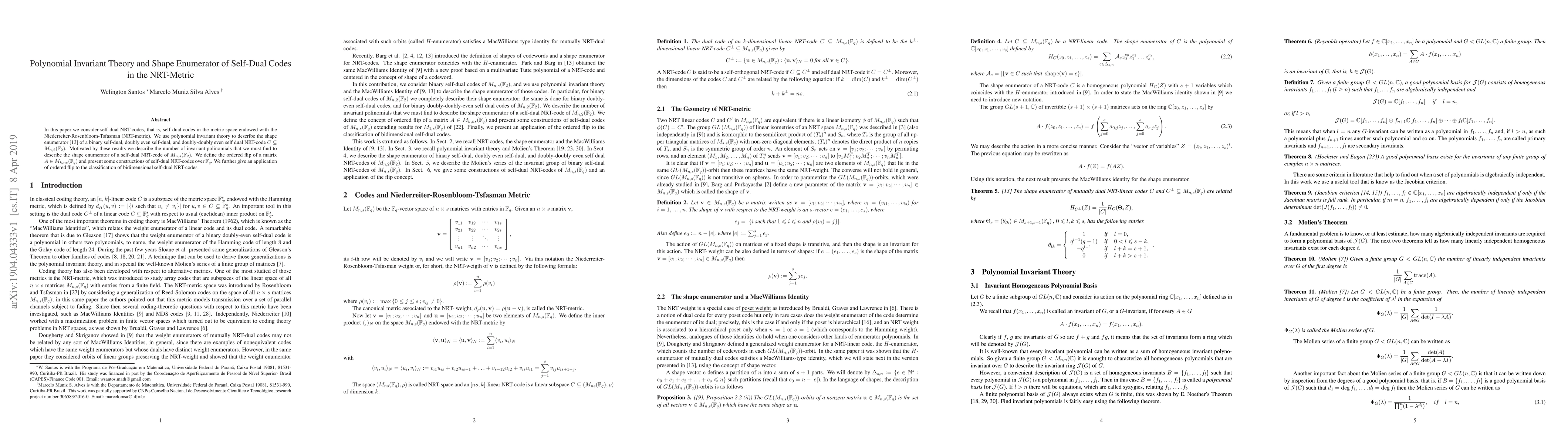 This paper explores self-dual NRT-codes in the Niederreiter-Rosenbloom-Tsfasman metric using polynomial invariant theory to determine their shape enumerators. It also investigates the number of invariant polynomials needed to describe these codes and applies the concept of ordered flip for classifying bidimensional self-dual NRT-codes.