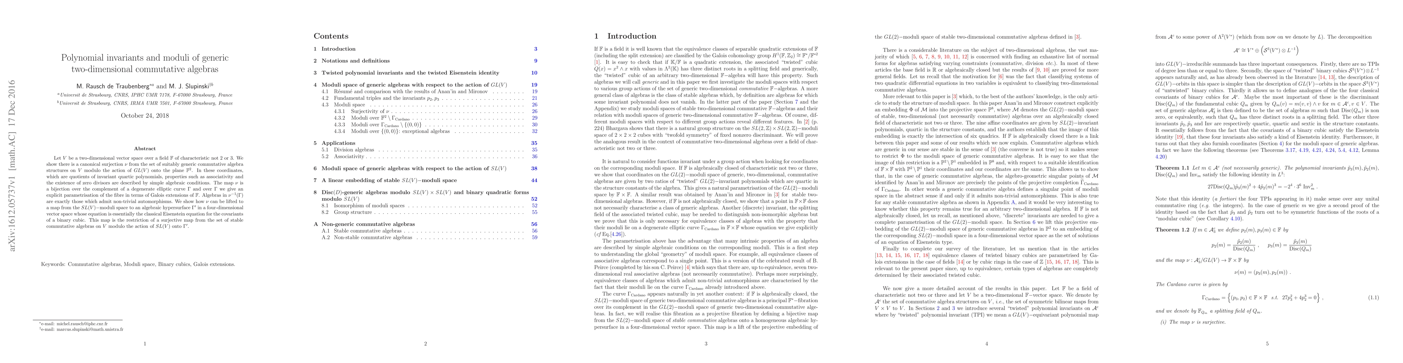 Let $V$ be a two-dimensional vector space over a field $\mathbb F$ of characteristic not $2$ or $3$. We show there is a canonical surjection $\nu$ from the set of suitably generic commutative algebra structures on $V$ modulo the action of $GL(V)$ onto the plane $\mathbb F^2$. In these coordinates, which are quotients of invariant quartic polynomials, properties such as associativity and the existence of zero divisors are described by simple algebraic conditions. The map $\nu$ is a bijection over the complement of a degenerate elliptic curve $\Gamma$ and over $\Gamma$ we give an explicit parametrisation of the fibre in terms of Galois extensions of $\mathbb F$. Algebras in $\nu^{-1}(\Gamma)$ are exactly those which admit non-trivial automorphisms. We show how $\nu$ can be lifted to a map from the $SL(V)-$moduli space to an algebraic hypersurface $\Gamma'$ in a four-dimensional vector space whose equation is essentially the classical Eisenstein equation for the covariants of a binary cubic. This map is the restriction of a surjective map from the set of stable commutative algebras on $V$ modulo the action of $SL(V)$ onto $\Gamma'$.