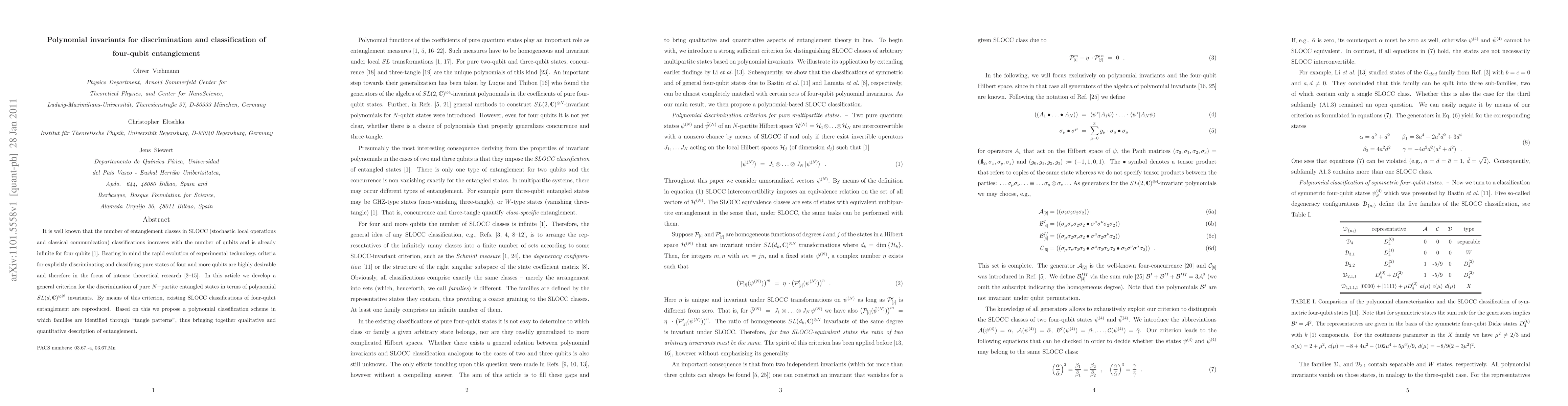 This paper develops a criterion using polynomial invariants to discriminate and classify pure entangled states of four qubits in SLOCC classifications, reproducing existing classifications and proposing a new polynomial classification scheme based on 'tangle patterns'.
