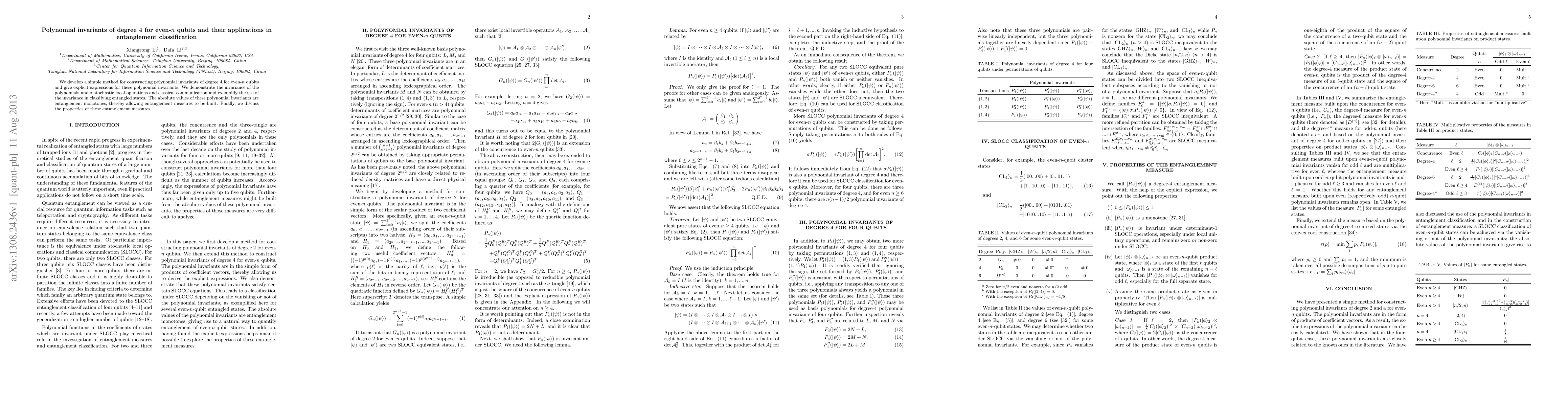 This research presents a method to create degree 4 polynomial invariants for even-numbered qubits, proving their invariance under specific quantum operations. These invariants can classify entangled states and serve as entanglement monotones for building entanglement measures, with discussed properties of resulting entanglement measures.