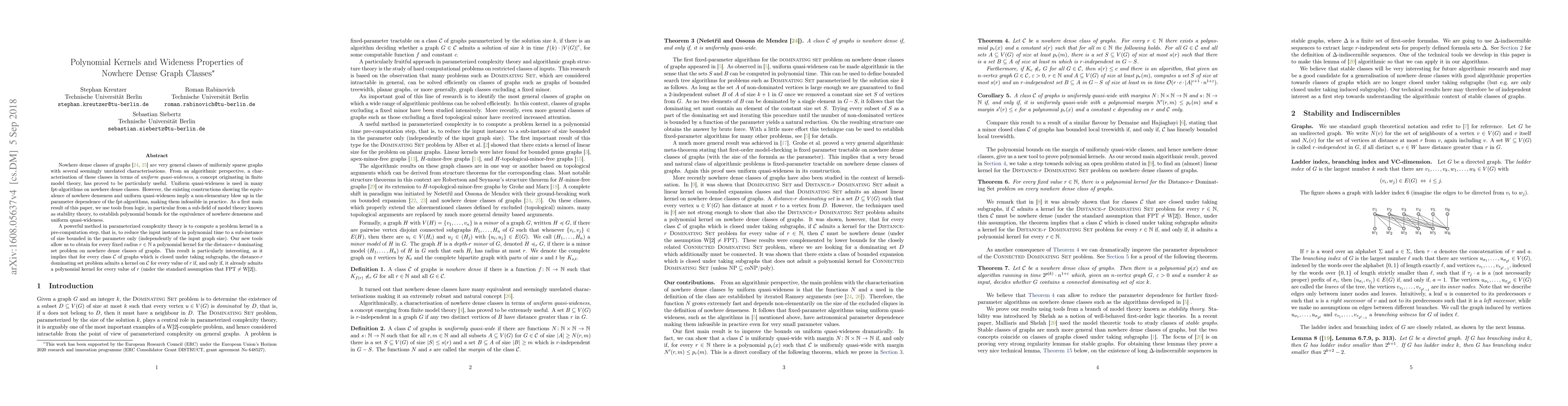 Nowhere dense classes of graphs are very general classes of uniformly sparse graphs with several seemingly unrelated characterisations. From an algorithmic perspective, a characterisation of these classes in terms of uniform quasi-wideness, a concept originating in finite model theory, has proved to be particularly useful. Uniform quasi-wideness is used in many fpt-algorithms on nowhere dense classes. However, the existing constructions showing the equivalence of nowhere denseness and uniform quasi-wideness imply a non-elementary blow up in the parameter dependence of the fpt-algorithms, making them infeasible in practice. As a first main result of this paper, we use tools from logic, in particular from a subfield of model theory known as stability theory, to establish polynomial bounds for the equivalence of nowhere denseness and uniform quasi-wideness. A powerful method in parameterized complexity theory is to compute a problem kernel in a pre-computation step, that is, to reduce the input instance in polynomial time to a sub-instance of size bounded in the parameter only (independently of the input graph size). Our new tools allow us to obtain for every fixed value of $r$ a polynomial kernel for the distance-$r$ dominating set problem on nowhere dense classes of graphs. This result is particularly interesting, as it implies that for every class $\mathcal{C}$ of graphs which is closed under subgraphs, the distance-$r$ dominating set problem admits a kernel on $\mathcal{C}$ for every value of $r$ if, and only if, it admits a polynomial kernel for every value of $r$ (under the standard assumption of parameterized complexity theory that $\mathrm{FPT} \neq W[2]$).