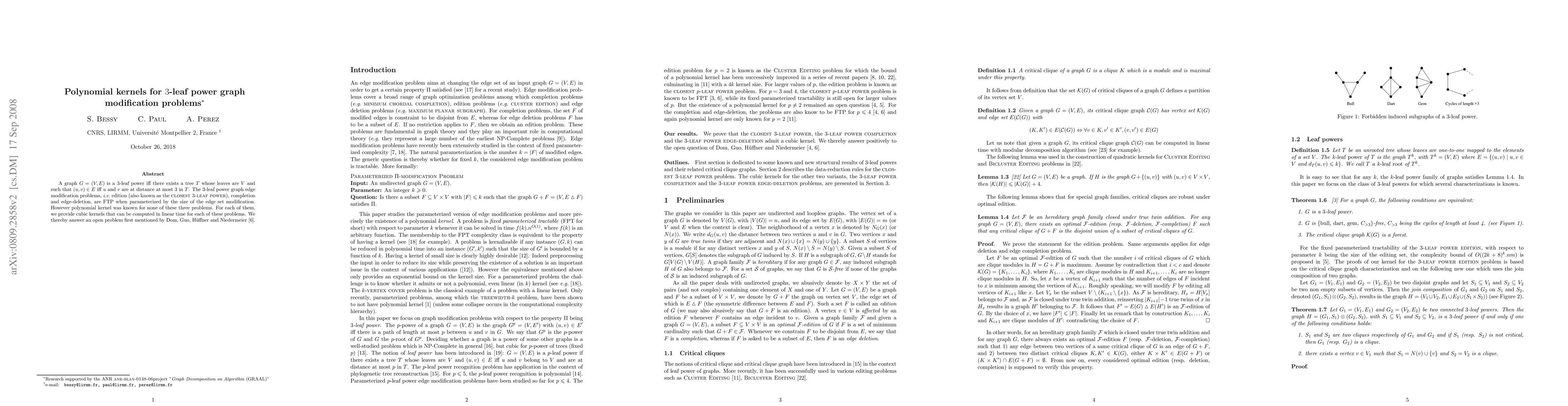 This paper addresses the 3-leaf power graph modification problems—edge edition, completion, and deletion—showing they are Fixed-Parameter Tractable when parameterized by the size of edge modifications. The authors provide cubic kernels that can be computed in linear time, thus solving an open problem regarding the existence of polynomial kernels for these problems.