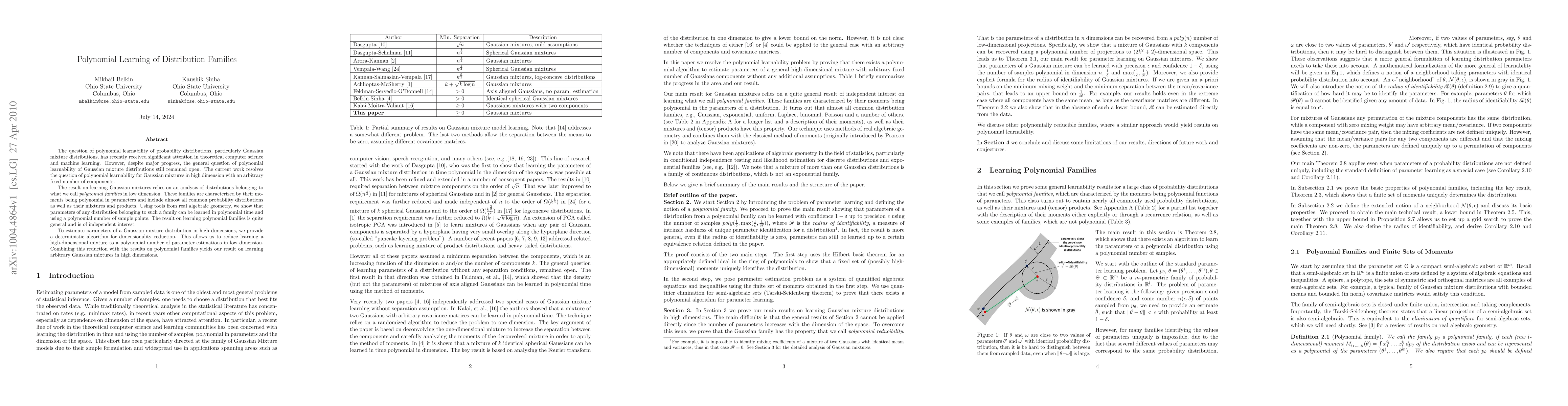 The question of polynomial learnability of probability distributions, particularly Gaussian mixture distributions, has recently received significant attention in theoretical computer science and machine learning. However, despite major progress, the general question of polynomial learnability of Gaussian mixture distributions still remained open. The current work resolves the question of polynomial learnability for Gaussian mixtures in high dimension with an arbitrary fixed number of components. The result on learning Gaussian mixtures relies on an analysis of distributions belonging to what we call "polynomial families" in low dimension. These families are characterized by their moments being polynomial in parameters and include almost all common probability distributions as well as their mixtures and products. Using tools from real algebraic geometry, we show that parameters of any distribution belonging to such a family can be learned in polynomial time and using a polynomial number of sample points. The result on learning polynomial families is quite general and is of independent interest. To estimate parameters of a Gaussian mixture distribution in high dimensions, we provide a deterministic algorithm for dimensionality reduction. This allows us to reduce learning a high-dimensional mixture to a polynomial number of parameter estimations in low dimension. Combining this reduction with the results on polynomial families yields our result on learning arbitrary Gaussian mixtures in high dimensions.