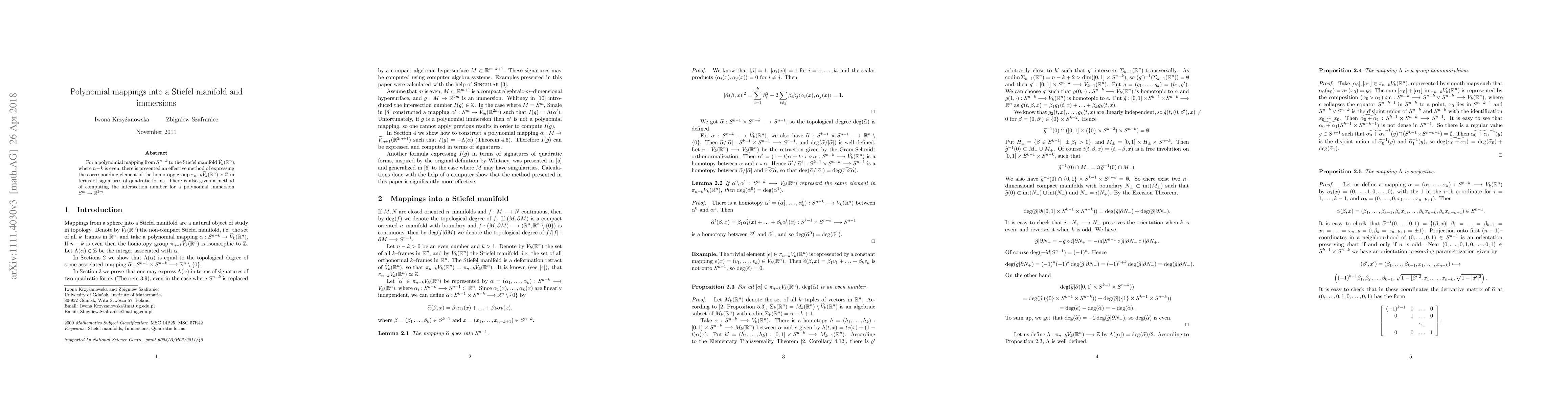 This paper presents a method to express the homotopy group element of polynomial mappings from S^{n-k} to the Stiefel manifold in terms of quadratic form signatures, and also provides a technique for computing the intersection number for polynomial immersions from S^m to \R^{2m}.