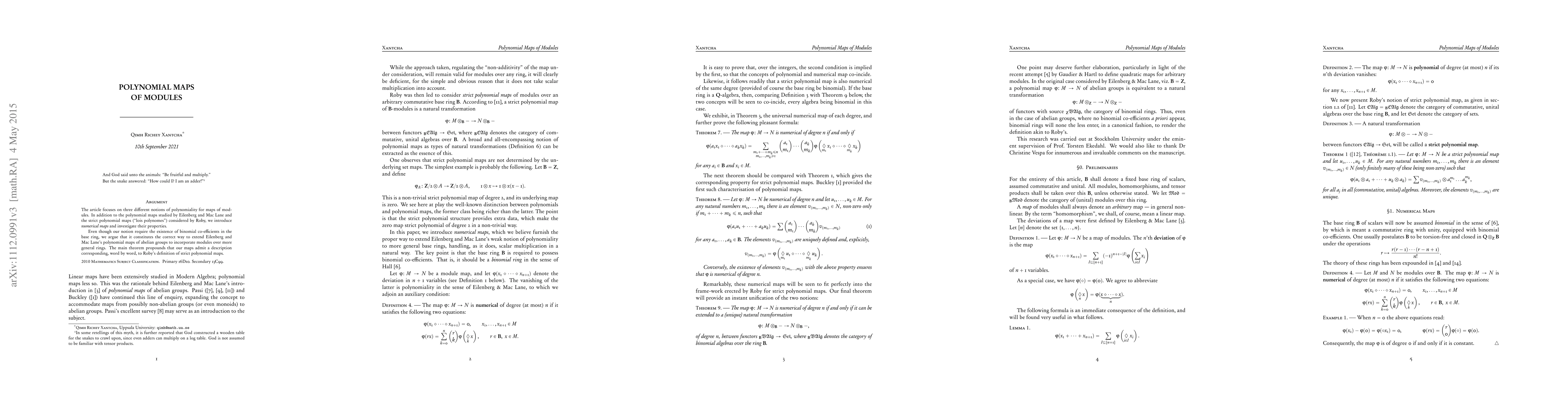 This paper explores three types of polynomial maps for modules: Eilenberg and Mac Lane's polynomial maps, Roby's strict polynomial maps, and introduces numerical maps. The authors argue that their notion of numerical maps, requiring binomial coefficients, extends Eilenberg and Mac Lane's polynomial maps to modules over general rings, and prove that these maps align with Roby's definition of strict polynomial maps.