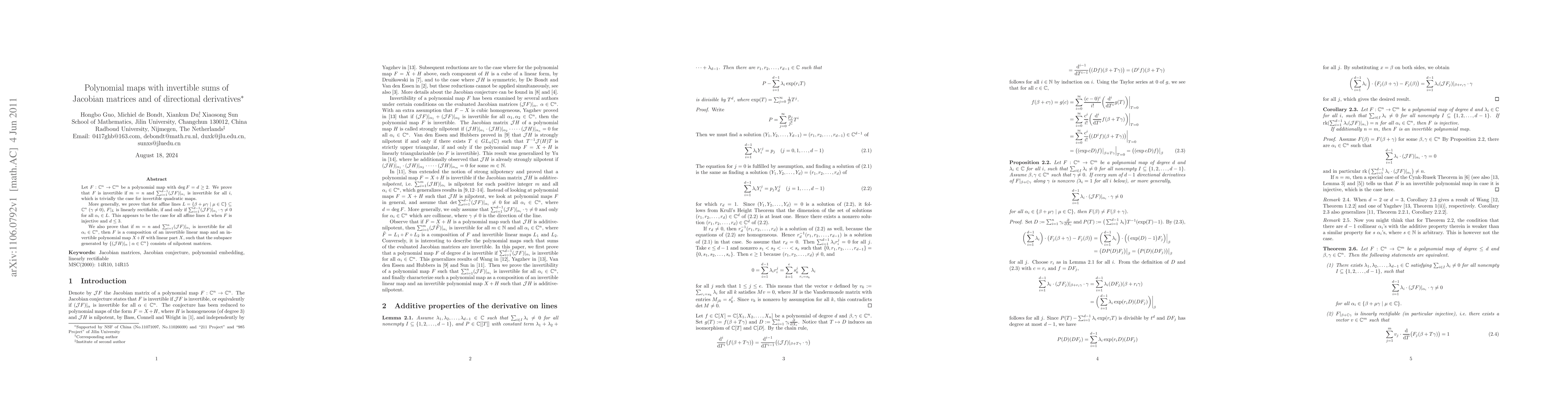 A polynomial map is proven to be invertible if its Jacobian matrix sums to an invertible value along certain affine lines, with implications for linear rectifiability and composition of invertible maps.