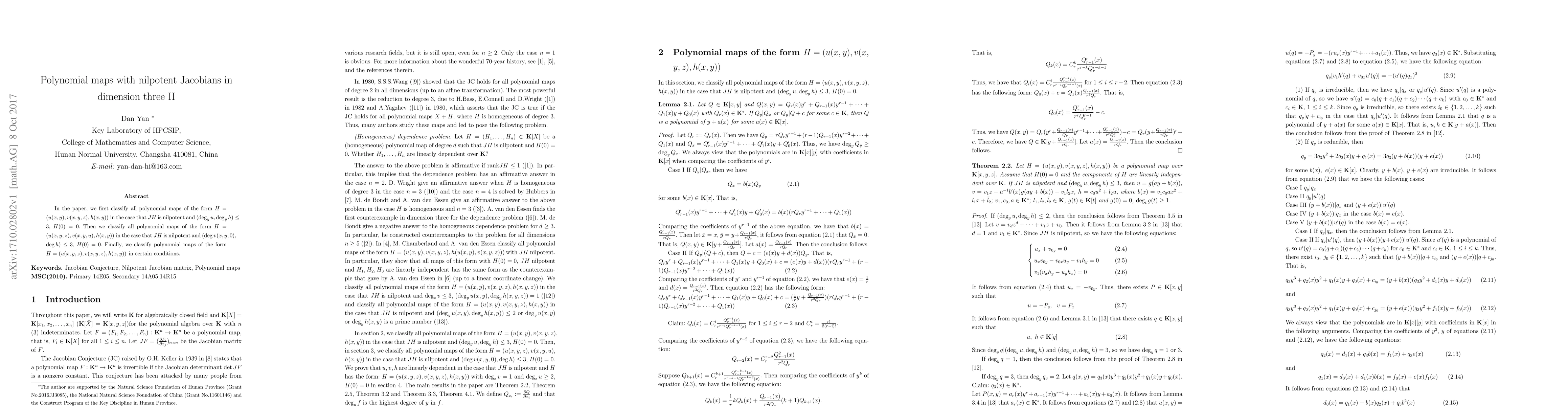 In the paper, we first classify all polynomial maps of the form $H=(u(x,y),v(x,y,z), h(x,y))$ in the case that $JH$ is nilpotent and $(\deg_yu,\deg_yh)\leq 3$, $H(0)=0$. Then we classify all polynomial maps of the form $H=(u(x,y,z),v(x,y,u), h(x,y))$ in the case that $JH$ is nilpotent and $(\deg v(x,y,0),\deg h)\leq 3$, $H(0)=0$. Finally, we classify polynomial maps of the form $H=(u(x,y,z),v(x,y,z), h(x,y))$ in certain conditions.