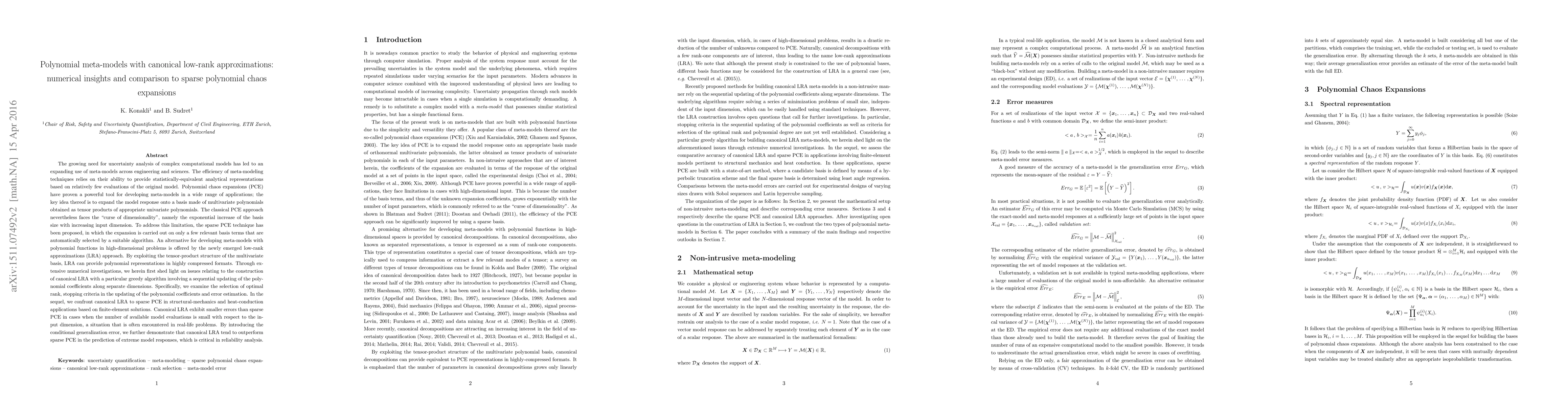 A new approach to meta-modeling called low-rank approximations (LRA) is compared to sparse polynomial chaos expansions, showing LRA can outperform its counterpart in predicting extreme model responses, especially when evaluations of the original model are limited.