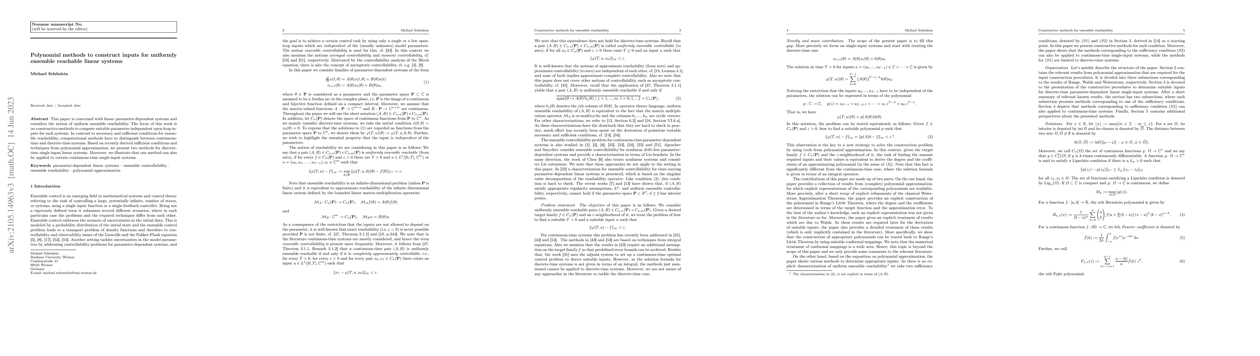 This paper develops polynomial methods to construct inputs for uniformly ensemble reachable linear systems, presenting two algorithms for discrete-time single-input systems and demonstrating the applicability of one method to certain continuous-time systems. The focus is on parameter-independent open-loop inputs based on sufficient conditions and complex approximation techniques.
