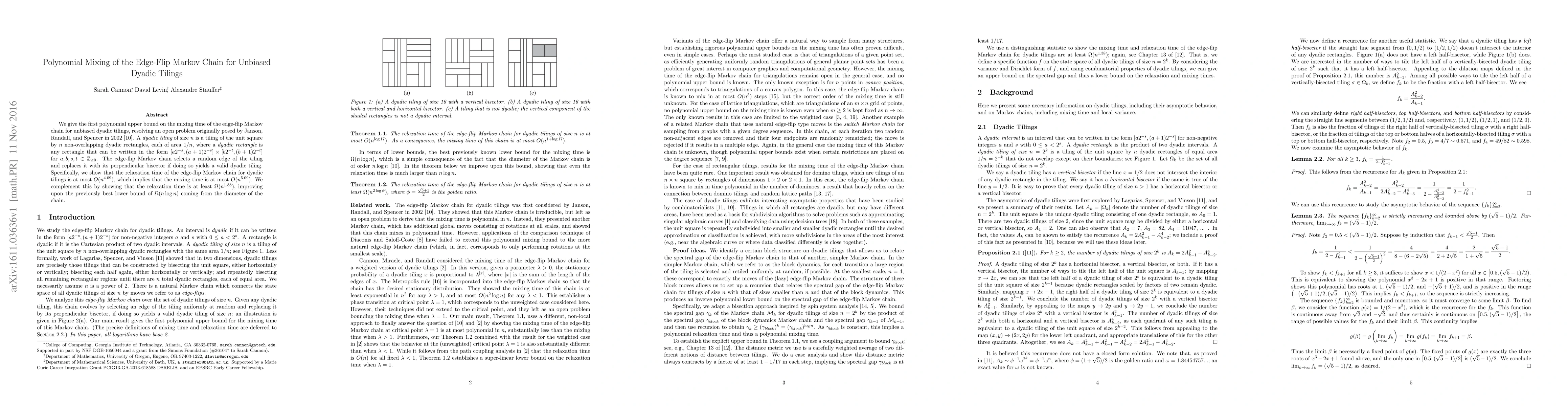 This paper resolves an open problem by providing the first polynomial upper bound on the mixing time of the edge-flip Markov chain for unbiased dyadic tilings, showing it is at most O(n^{5.09}). It also improves the lower bound to \Omega(n^{1.38}).