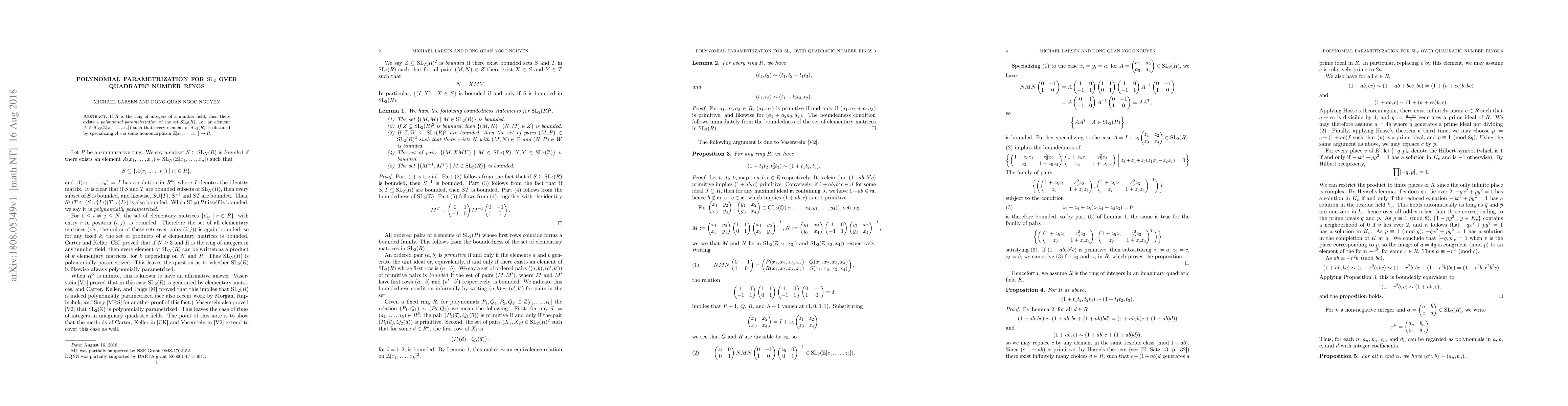 If $R$ is the ring of integers of a number field, then there exists a polynomial parametrization of the set $\text{SL}_2(R)$, i.e., an element $A \in \text{SL}_2(\mathbb{Z}[x_1,\ldots,x_n])$ such that every element of $\text{SL}_2(R)$ is obtained by specializing $A$ via some homomorphism $\mathbb{Z}[x_1,\ldots,x_n]\to R$.