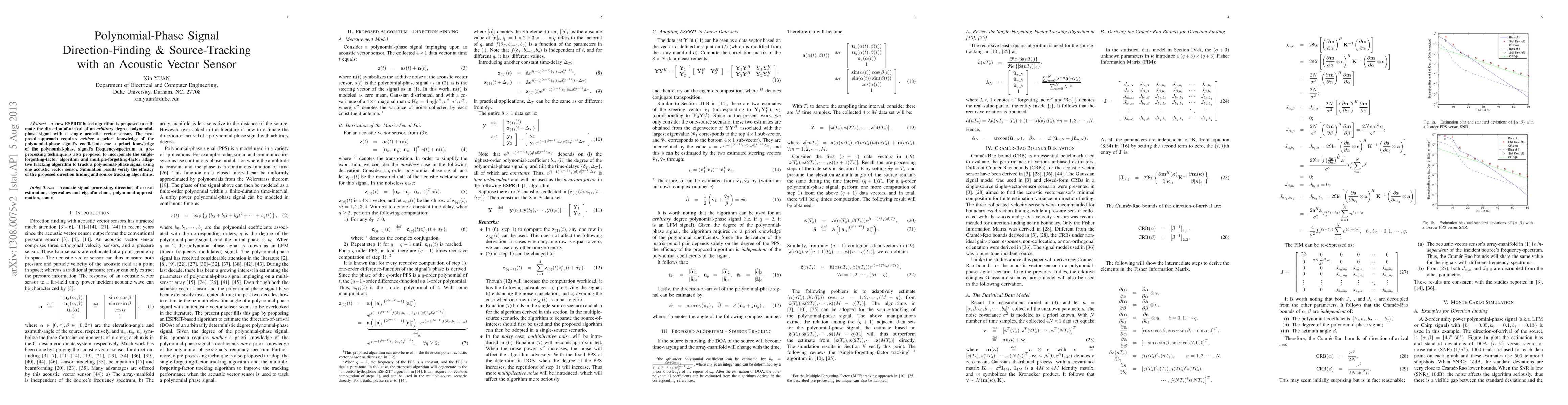 A new ESPRIT-based algorithm is proposed to estimate the direction-of-arrival of an arbitrary degree polynomial-phase signal with a single acoustic vector sensor. The proposed approach requires neither a priori knowledge of the polynomial-phase signal's coefficients nor a priori knowledge of the polynomial-phase signal's frequency-spectrum. A pre-processing technique is also proposed to incorporate the single-forgetting-factor algorithm and multiple-forgetting-factor adaptive tracking algorithm to track a polynomial-phase signal using one acoustic vector sensor. Simulation results verify the efficacy of the proposed direction finding and source tracking algorithms.