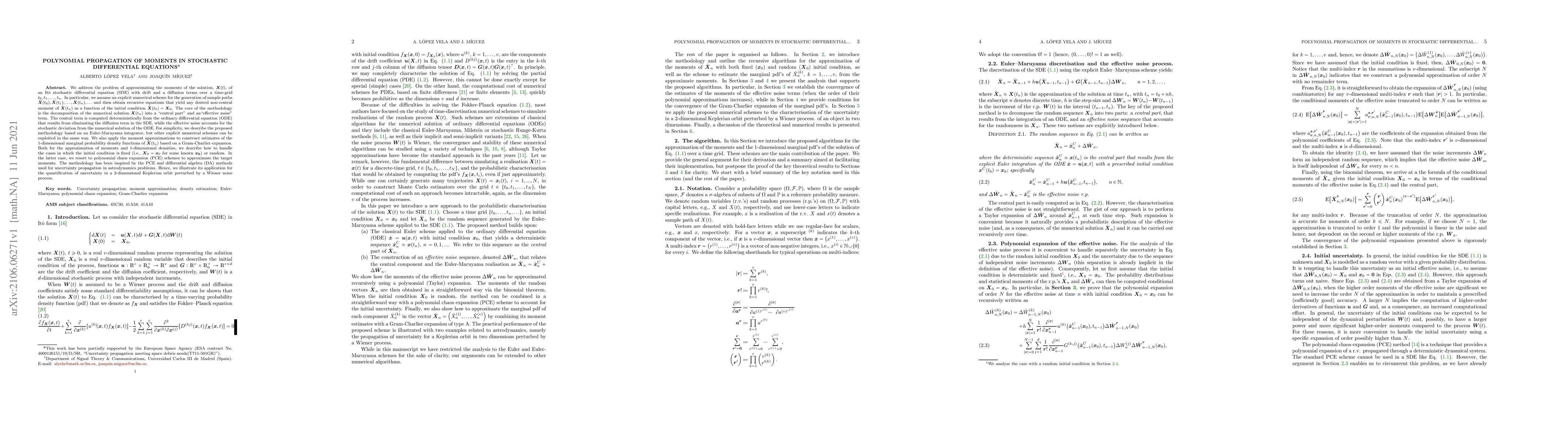 We address the problem of approximating the moments of the solution, $\boldsymbol{X}(t)$, of an It\^o stochastic differential equation (SDE) with drift and a diffusion terms over a time-grid $t_0, t_1, \ldots, t_n$. In particular, we assume an explicit numerical scheme for the generation of sample paths $\hat{\boldsymbol{X}}(t_0), \ldots, \hat{\boldsymbol{X}}(t_n), \ldots$ and then obtain recursive equations that yield any desired non-central moment of $\hat{\boldsymbol{X}}(t_n)$ as a function of the initial condition $\boldsymbol{X}_0$. The core of the methodology is the decomposition of the numerical solution into a "central part" and an "effective noise" term. The central term is computed deterministically from the ordinary differential equation (ODE) that results from eliminating the diffusion term in the SDE, while the effective noise accounts for the stochastic deviation from the numerical solution of the ODE. For simplicity, we describe algorithms based on an Euler-Maruyama integrator, but other explicit numerical schemes can be exploited in the same way. We also apply the moment approximations to construct estimates of the 1-dimensional marginal probability density functions of $\hat{\boldsymbol{X}}(t_n)$ based on a Gram-Charlier expansion. Both for the approximation of moments and 1-dimensional densities, we describe how to handle the cases in which the initial condition is fixed (i.e., $\boldsymbol{X}_0 = \boldsymbol{x}_0$ for some known $\boldsymbol{x_0}$) or random. In the latter case, we resort to polynomial chaos expansion (PCE) schemes to approximate the target moments. The methodology has been inspired by the PCE and differential algebra (DA) methods used for uncertainty propagation in astrodynamics problems. Hence, we illustrate its application for the quantification of uncertainty in a 2-dimensional Keplerian orbit perturbed by a Wiener noise process.
