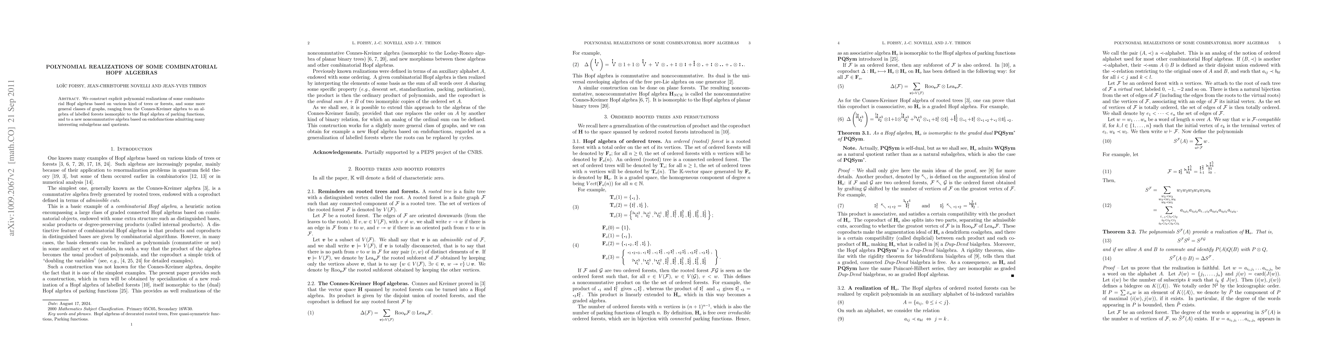 We construct explicit polynomial realizations of some combinatorial Hopf algebras based on various kind of trees or forests, and some more general classes of graphs, ranging from the Connes-Kreimer algebra to an algebra of labelled forests isomorphic to the Hopf algebra of parking functions, and to a new noncommutative algebra based on endofunctions admitting many interesting subalgebras and quotients.