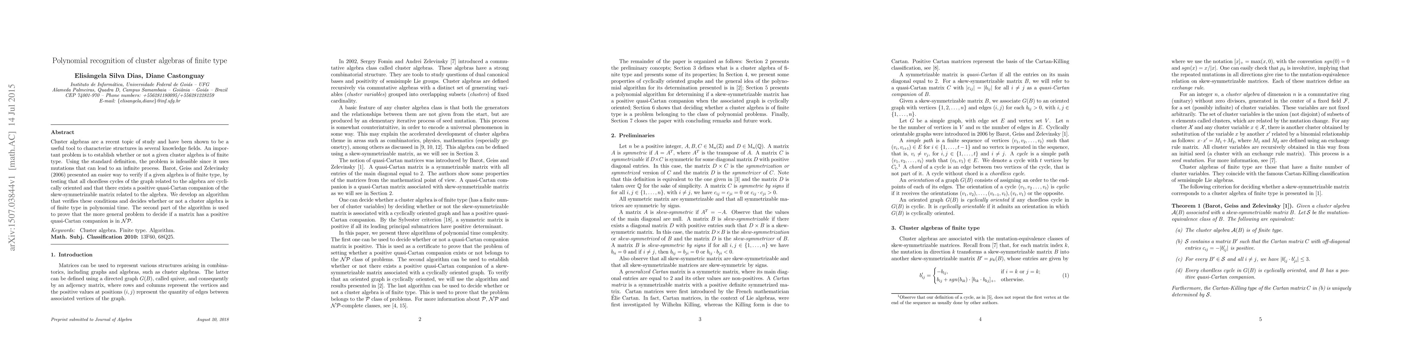 Cluster algebras are a recent topic of study and have been shown to be a useful tool to characterize structures in several knowledge fields. An important problem is to establish whether or not a given cluster algebra is of finite type. Using the standard definition, the problem is infeasible since it uses mutations that can lead to an infinite process. Barot, Geiss and Zelevinsky (2006) presented an easier way to verify if a given algebra is of finite type, by testing that all chordless cycles of the graph related to the algebra are cyclically oriented and that there exists a positive quasi-Cartan companion of the skew-symmetrizable matrix related to the algebra. We develop an algorithm that verifies these conditions and decides whether or not a cluster algebra is of finite type in polynomial time. The second part of the algorithm is used to prove that the more general problem to decide if a matrix has a positive quasi-Cartan companion is in NP.