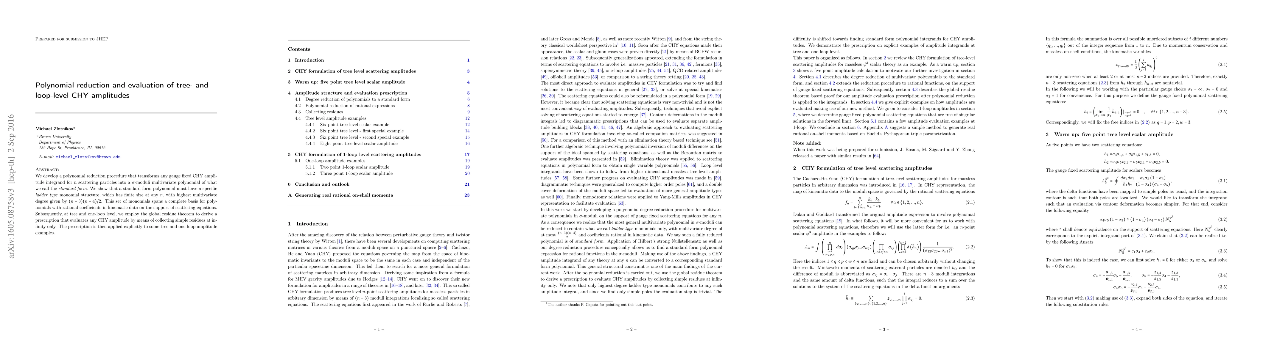 Researchers developed a method to simplify CHY amplitudes into polynomials with specific structures, enabling efficient evaluation of tree- and loop-level amplitudes using the global residue theorem.