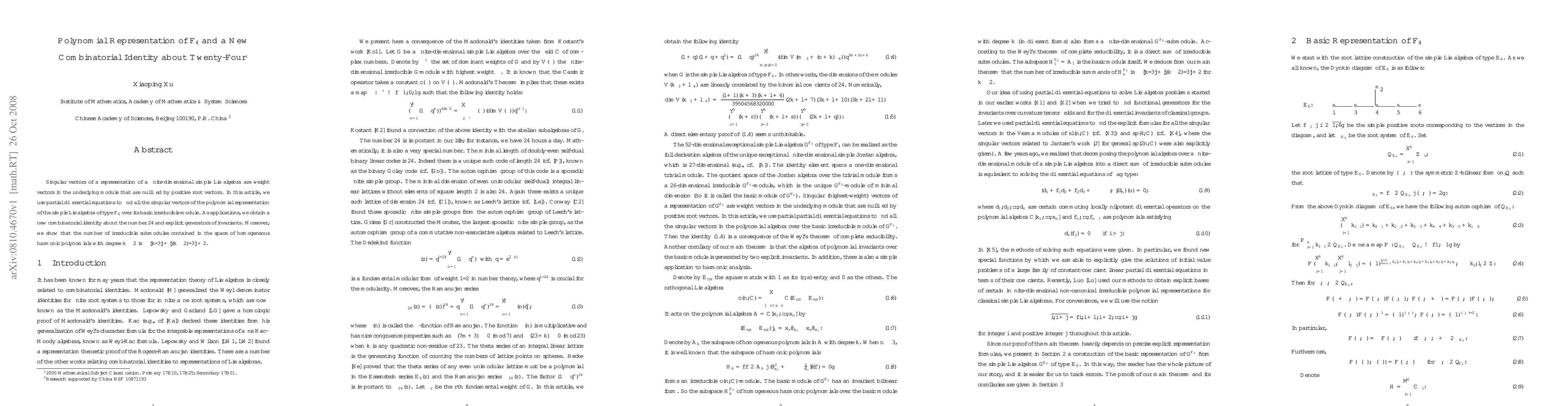 This research paper finds singular vectors of a representation of the simple Lie algebra $F_4$ using partial differential equations, leading to new combinatorial identities about 24 and explicit generators of invariants, with implications for harmonic polynomials.